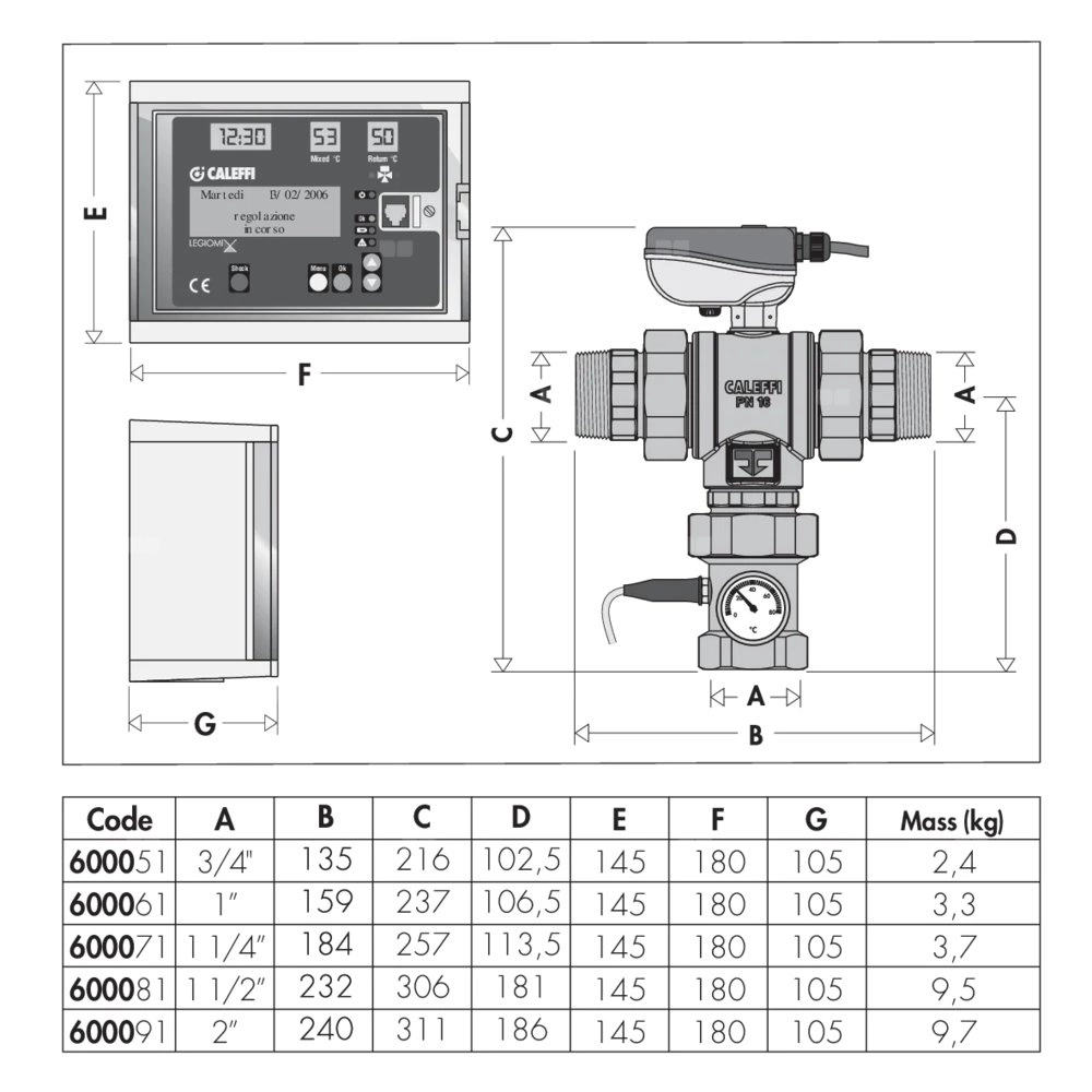 Elektroniczny zawór mieszający z programowalną dezynfekcją termiczną i dezynfekcją kontrolną 230 V. Przyłącza z gwintem zewnętrznym ze złączkami. Z mikroprzełącznikiem pomocniczym Zawiera: -trójdrożny zawór kulowy; -siłownik; -regulator; -czujnik temperatury wody zmieszanej; -czujnik temperatury wody cyrkulacyjnej. Przyłącze: R 1 1/2" (EN 10226-1) GZ, wlot, złączka. Przyłącze: G 1 1/2" (ISO 228-1) GW, wylot. Maksymalne ciśnienie pracy: 10 bar. Zakres temperatury medium: 0–100 °C. Zakres regulacji temperatury: 20–85 °C. Zakres temperatury dezynfekcji: 40–85 °C. Zasilanie elektryczne: 230 V (AC). Pobór mocy: (6,5+6) VA. Stopień ochrony: IP 65. Kv: 32,5 m³/h.