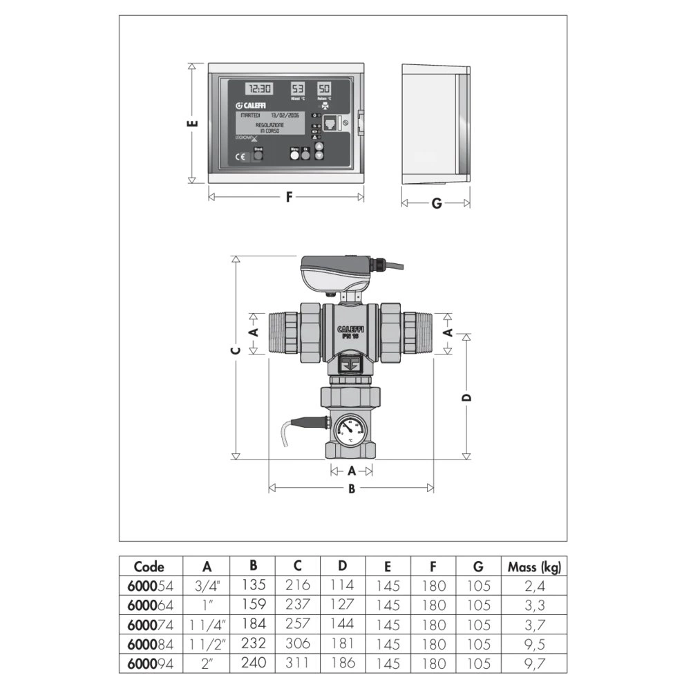 Elektroniczny zawór mieszający z programowalną dezynfekcją termiczną i dezynfekcją kontrolną 24 V. Przyłącza z gwintem zewnętrznym ze złączkami. Z mikroprzełącznikiem pomocniczym Zawiera: - trójdrożny zawór kulowy, - siłownik, - regulator, - czujnik temperatury wody zmieszanej, - czujnik temperatury wody cyrkulacyjnej. Możliwość zdalnego sterowania za pomocą protokołów RS-485 i MODBUS-RTU. Przyłącze: R 1 1/4" (EN 10226-1) GZ, wlot, złączka. Przyłącze: G 1 1/4" (ISO 228-1) GW, wylot. Maksymalne ciśnienie pracy: 10 bar. Zakres temperatury medium: 0–100 °C. Zakres regulacji temperatury: 20–85 °C. Zakres temperatury dezynfekcji: 40–85 °C. Zasilanie elektryczne: 24 V (AC). Pobór mocy: (6,5+6) VA. Stopień ochrony: IP 65. Kv: 21,2 m³/h.