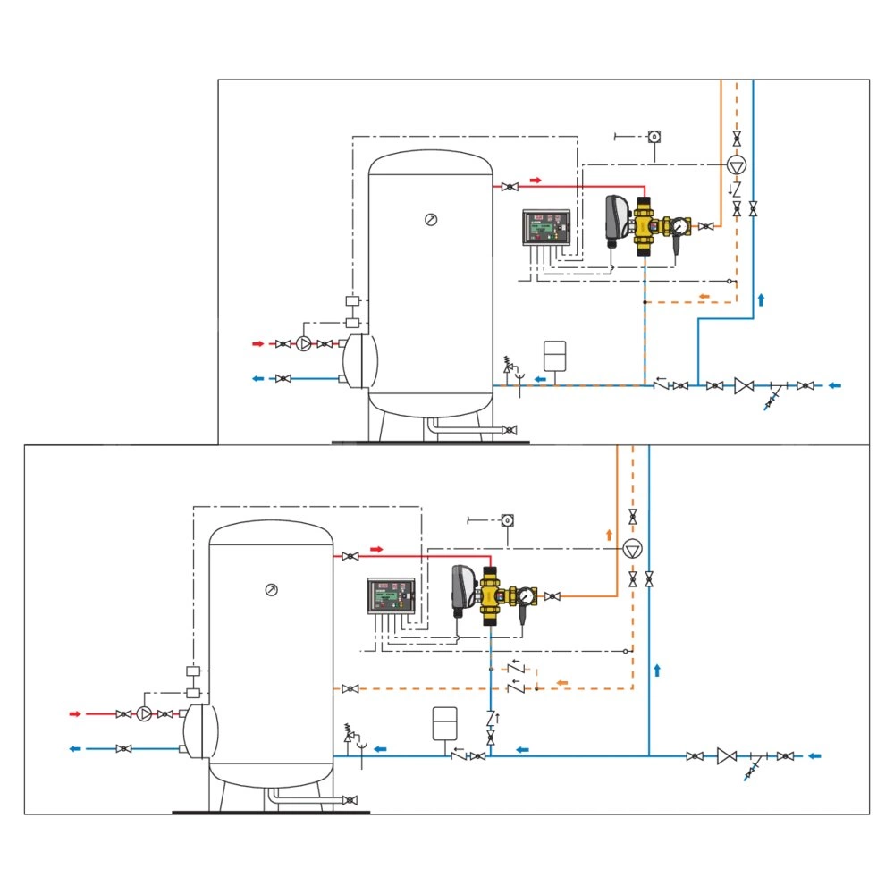 Elektroniczny zawór mieszający z programowalną dezynfekcją termiczną i dezynfekcją kontrolną 24 V. Przyłącza z gwintem zewnętrznym ze złączkami. Z mikroprzełącznikiem pomocniczym Zawiera: - trójdrożny zawór kulowy, - siłownik, - regulator, - czujnik temperatury wody zmieszanej, - czujnik temperatury wody cyrkulacyjnej. Możliwość zdalnego sterowania za pomocą protokołów RS-485 i MODBUS-RTU. Przyłącze: R 3/4" (EN 10226-1) GZ, wlot, złączka. Przyłącze: G 3/4" (ISO 228-1) GW, wylot. Maksymalne ciśnienie pracy: 10 bar. Zakres temperatury medium: 0–100 °C. Zakres regulacji temperatury: 20–85 °C. Zakres temperatury dezynfekcji: 40–85 °C. Zasilanie elektryczne: 24 V (AC). Pobór mocy: (6,5+6) VA. Stopień ochrony: IP 65. Kv: 8,4 m³/h.