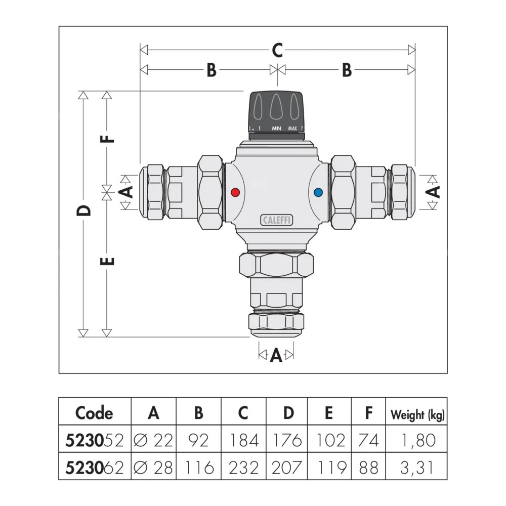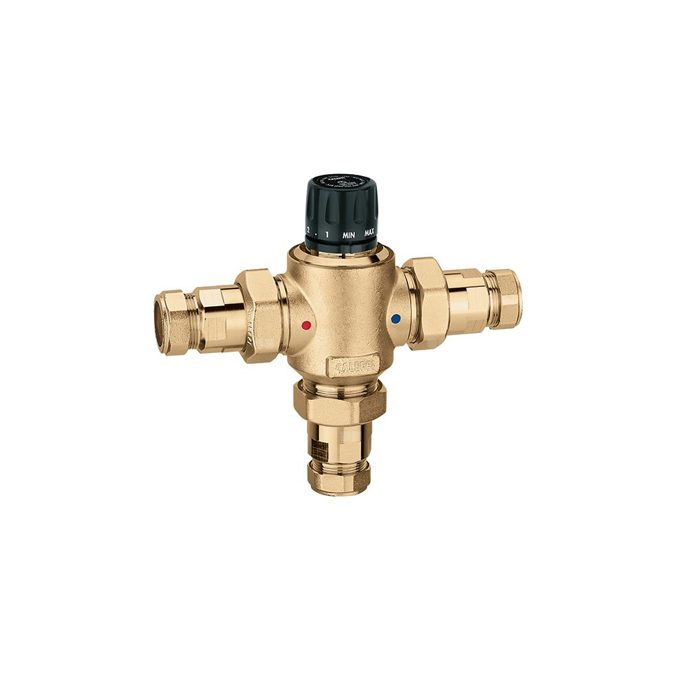 Regulowany termostatyczny zawór mieszający z wymiennym wkładem do systemów scentralizowanych Z zaworami zwrotnymi i złączkami zaciskowymi Przyłącze: Ø 22. Maksymalne ciśnienie pracy: 14 bar. Zakres regulacji temperatury: 30–65 °C. Maksymalna temperatura wlotowa: 85 °C. Kv: 4,5 m³/h. Materiał: mosiądz.