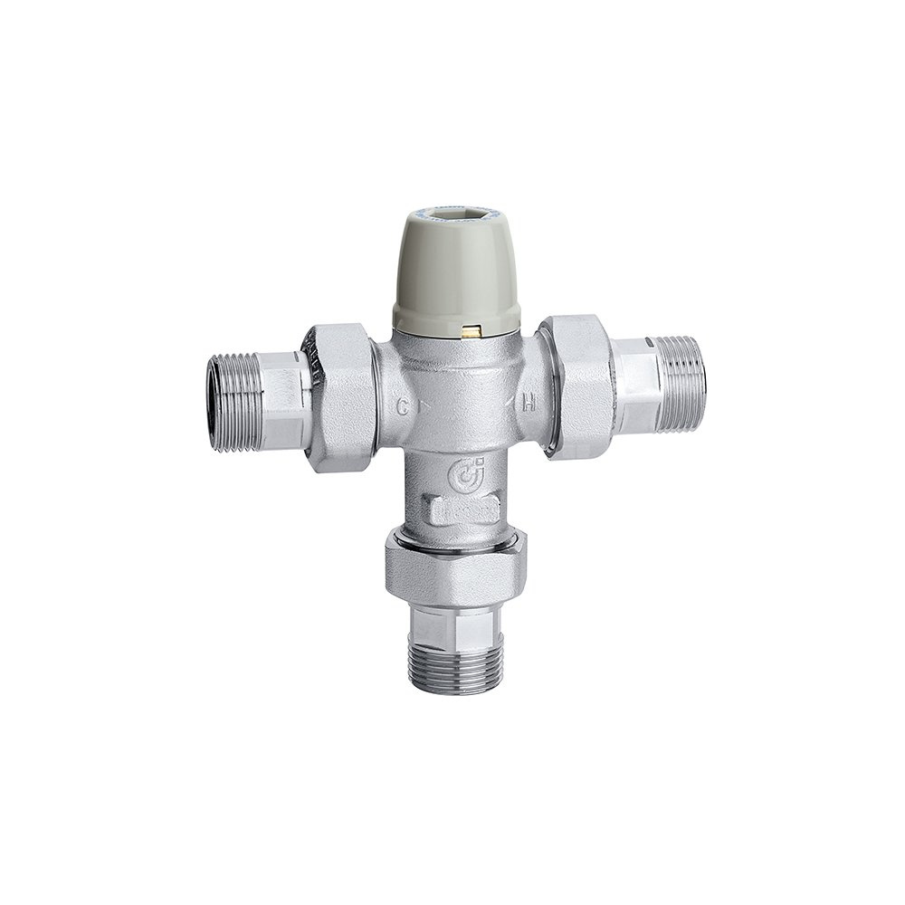 Regulowany, termostatyczny zawór mieszający z zaworami zwrotnymi i filtrami na wlotach 3/4" 30÷50 st. C