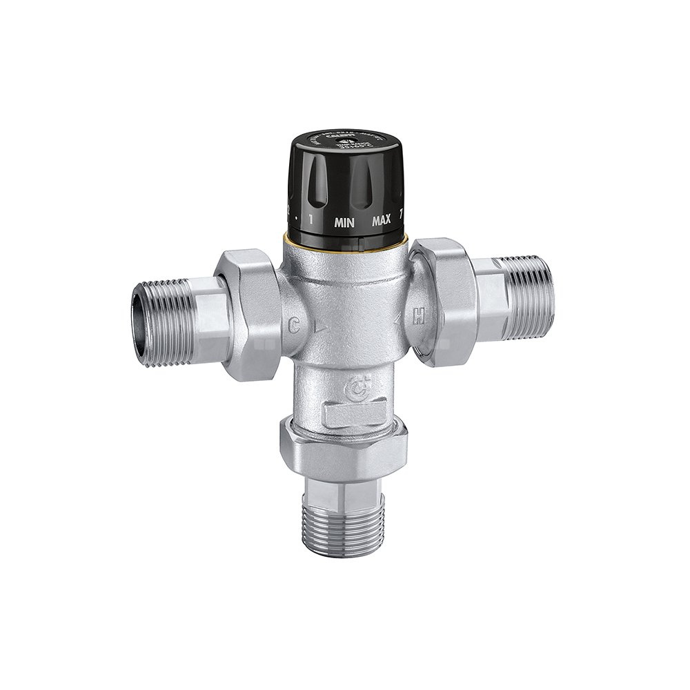 Regulowany termostatyczny zawór mieszający z zaworami zwrotnymi do regulacji temperatury w miejscu dystrybucji Z funkcją antyoparzeniową. Przyłącze: G 3/4" A (ISO 228-1) GZ. Maksymalne ciśnienie pracy: 10 bar. Zakres temperatury medium: 2–90 °C. Zakres regulacji temperatury: 35–65 °C. Wykończenie: chromowane. Kv: 1,7 m³/h. Materiał: stop mosiądzu odporny na odcynkowanie z niską zawartością ołowiu.