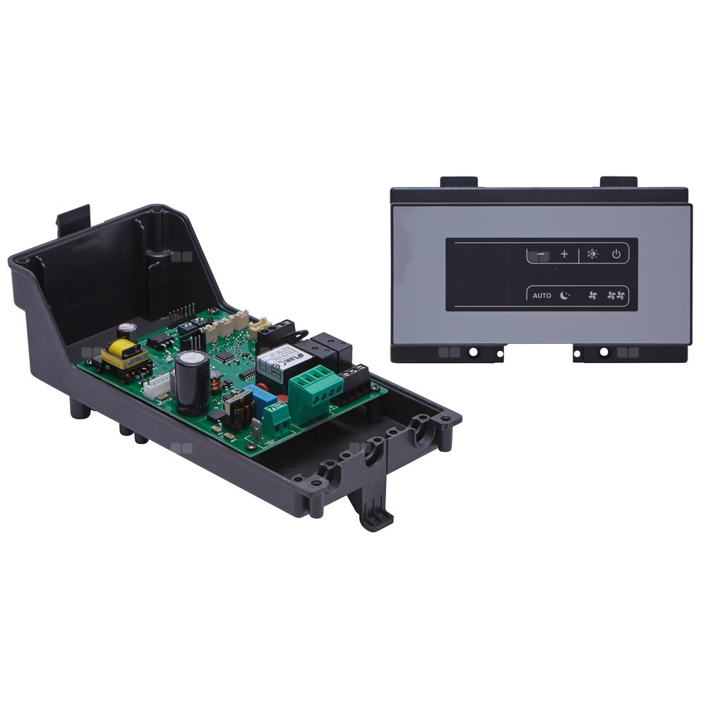 Zestaw termoregulacji modulującej, w tym: panel sterowania z wyświetlaczem, płytka elektroniczna i sonda NTC do pomiaru temperatury w pomieszczeniu.