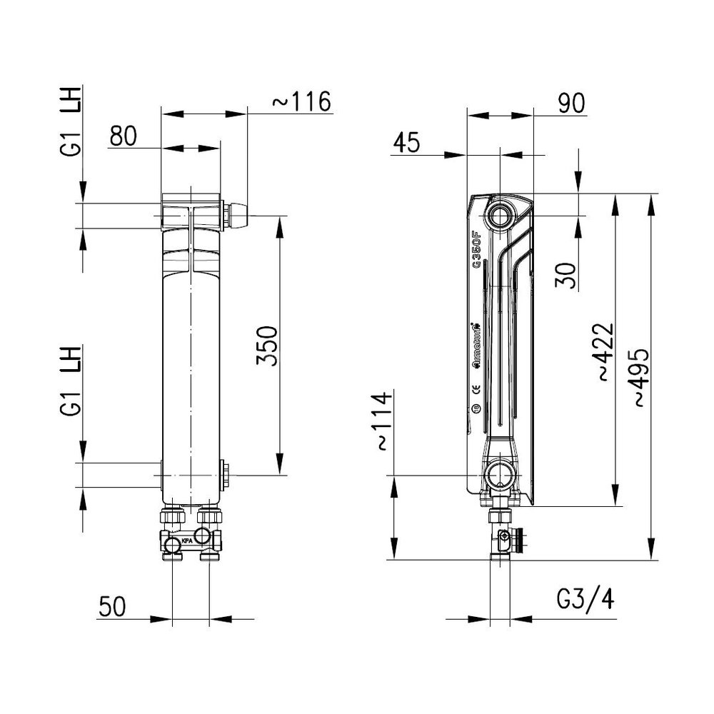 Grzejnik żeberkowy KFA Armatura G350F/D/1 aluminium, podłączenie dolne, prawe, proste 422 x 80 mm, kolor biały (RAL 9010)