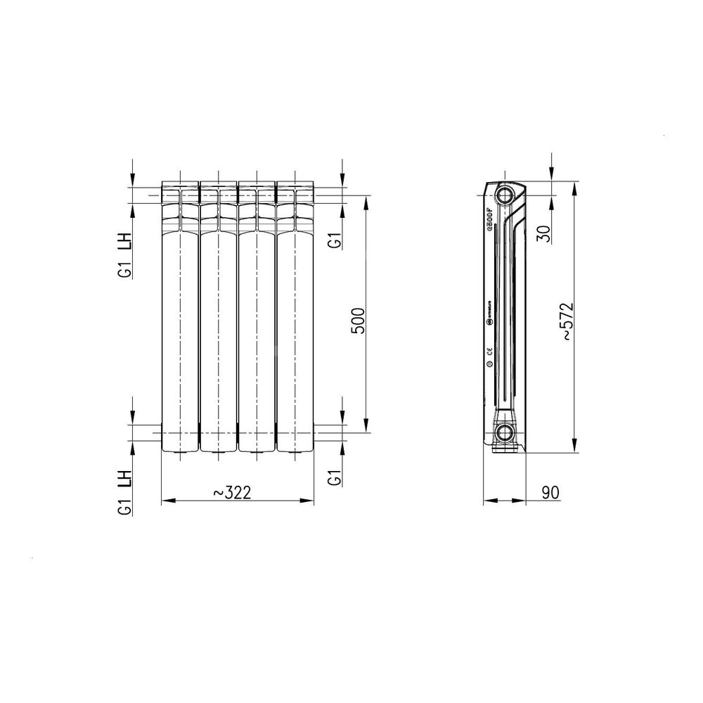 Grzejnik żeberkowy KFA Armatura G500F/4 aluminium, podłączenie boczne 572 x 322 mm, kolor biały (RAL 9010)