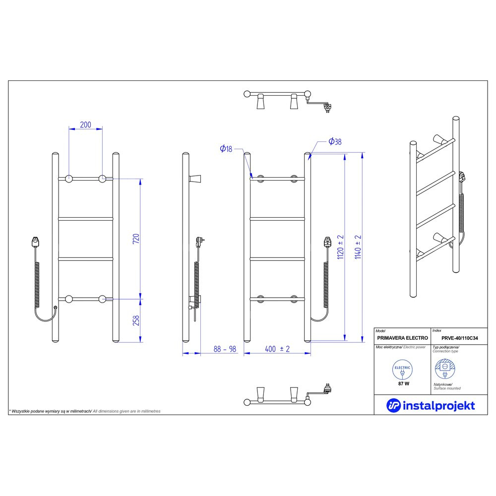 Grzejnik elektryczny (suszarka) INSTAL-PROJEKT PRIMAVERA ELECTRO, wym. 1120/400 mm, kolor czarny mat, moc 87 W