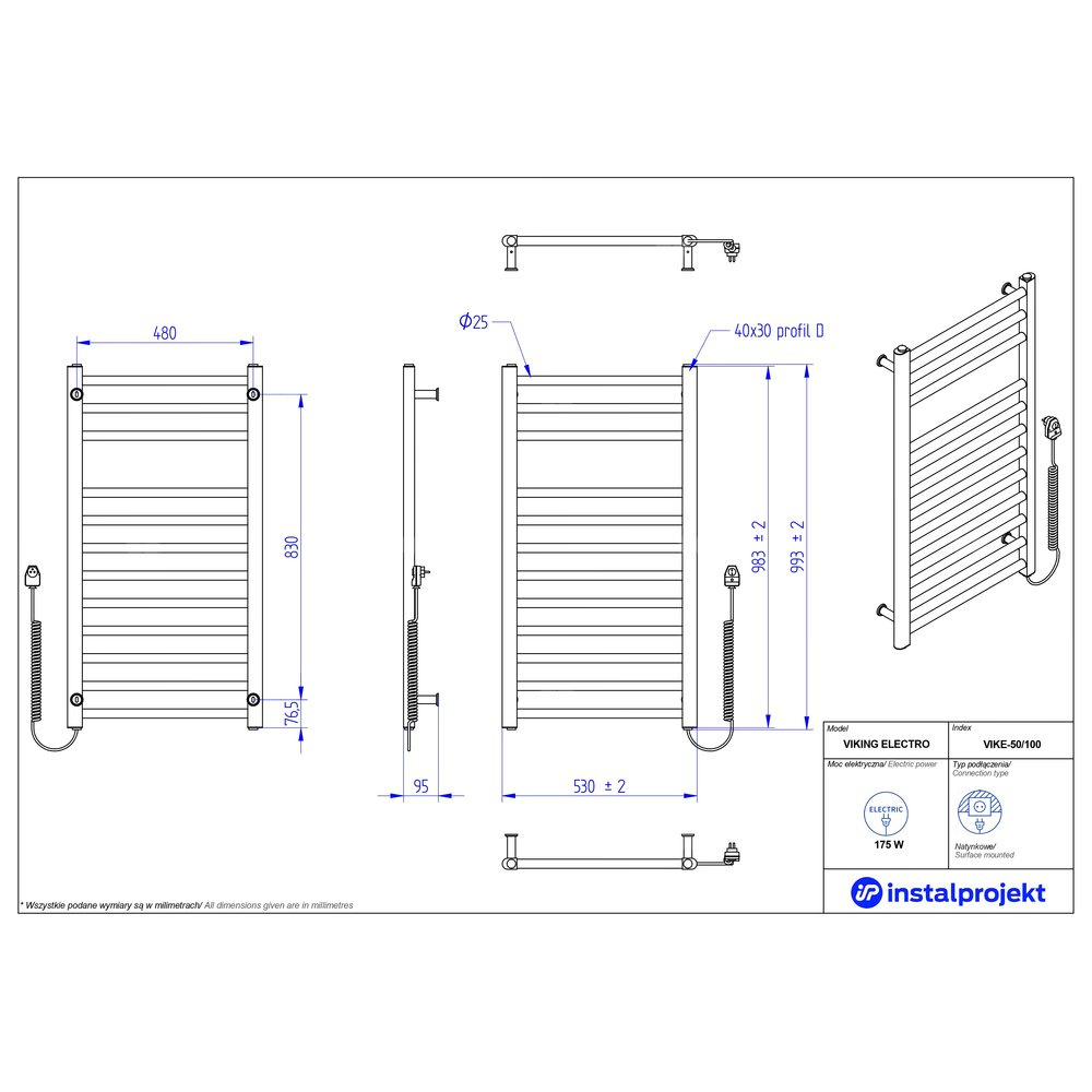 Grzejnik elektryczny (suszarka) INSTAL-PROJEKT VIKING ELECTRO, wym. 993/530 mm, kolor biały połysk, moc 175 W