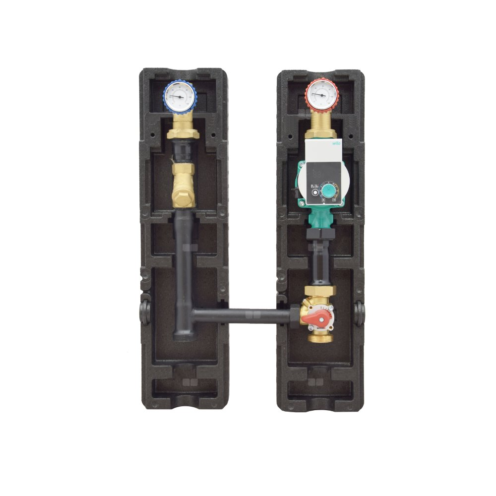 Parametry techniczne: rozstaw 250mm, podłączenie strona instalacyjna GW1”, strona kotłowa GZ 1 ½”, z zaworami kulowymi z termometrami, kvs zaworu mieszającego 8,3, zasilanie po prawej stronie, możliwość samodzielnej zamiany na zasilanie po lewej stronie, do montażu na rozdzielaczu wymagane łączniki DN 50 (kołnierz) x 1”(nakrętka G 1 1/2”).