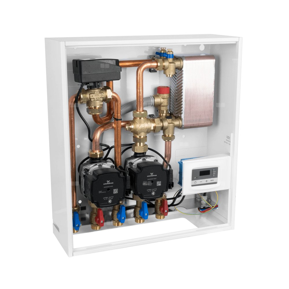 Stosowany do połączenia dwóch różnych źródeł ciepła poprzez oddzielanie ich obiegów za pomocą wymiennika płytowego.Montowany na lub w ścianie w pobliżu źródła ciepła.