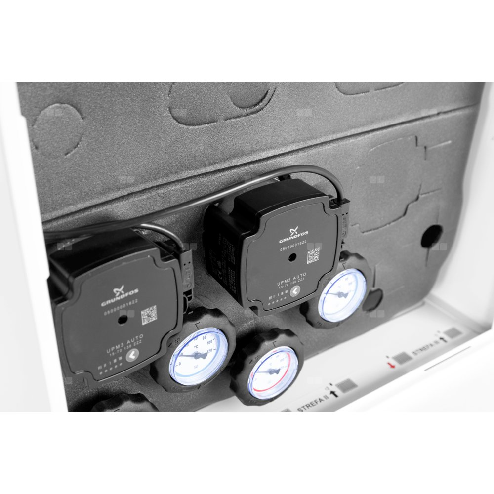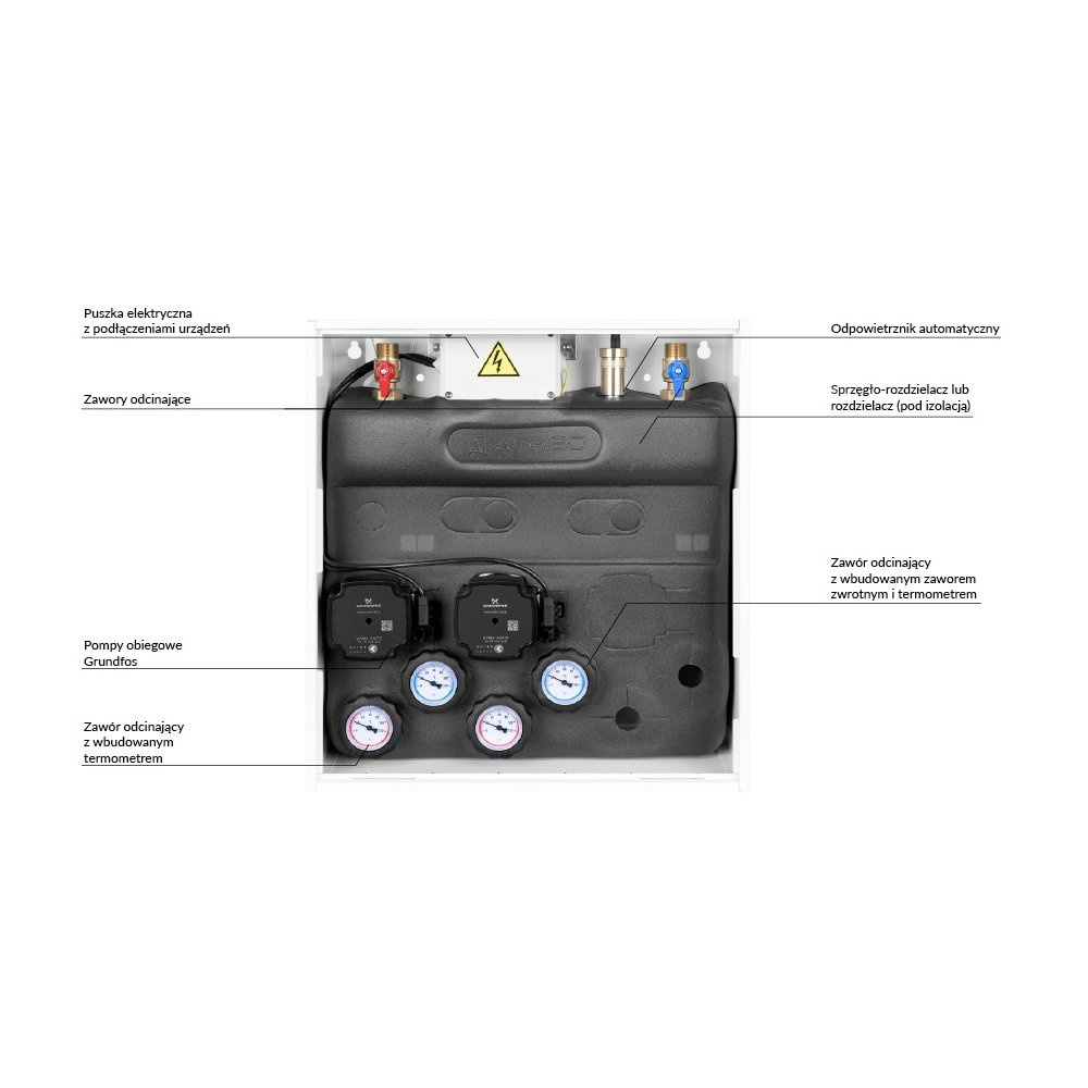 - Tworzy 2 obiegi grzewcze w oparciu o wbudowany rozdzielacz ze sprzęgłem hydraulicznym.