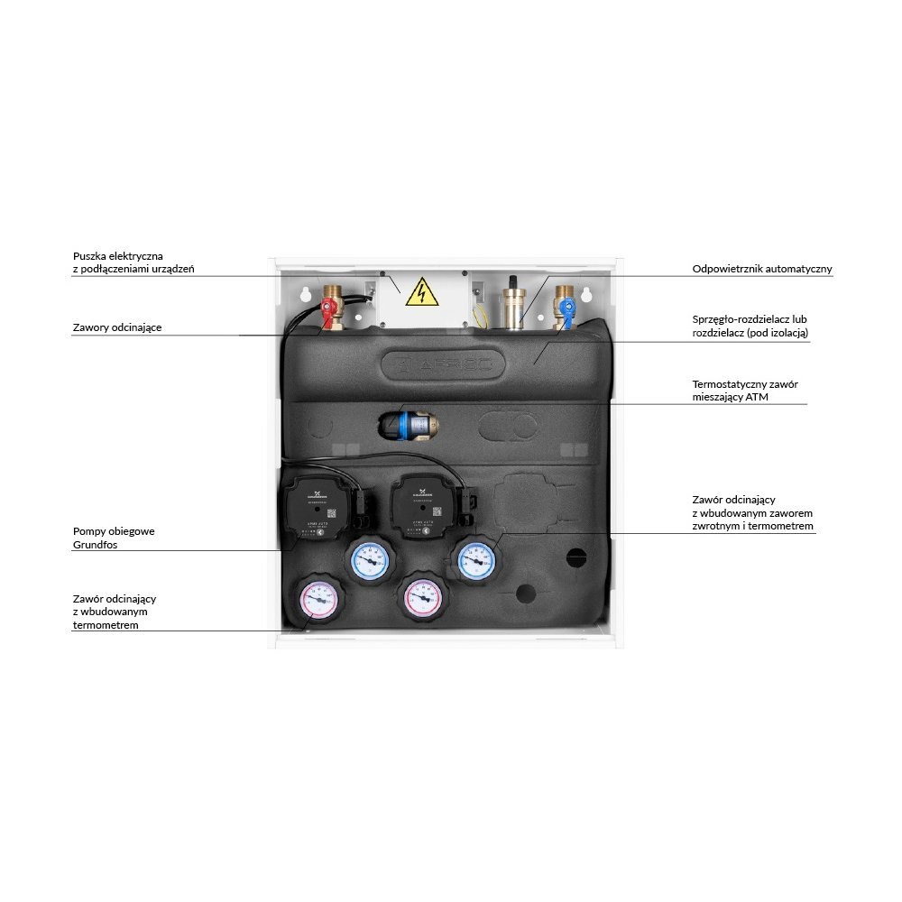 Wyposażony w pompy Grundfos UPm³ i termostatyczny zawór mieszający ATM 561 z regulacją 20 ÷ 43°C. Zakres dobrany na podstawie optymalnych temperatur zasilania instalacji ogrzewania podłogowego.