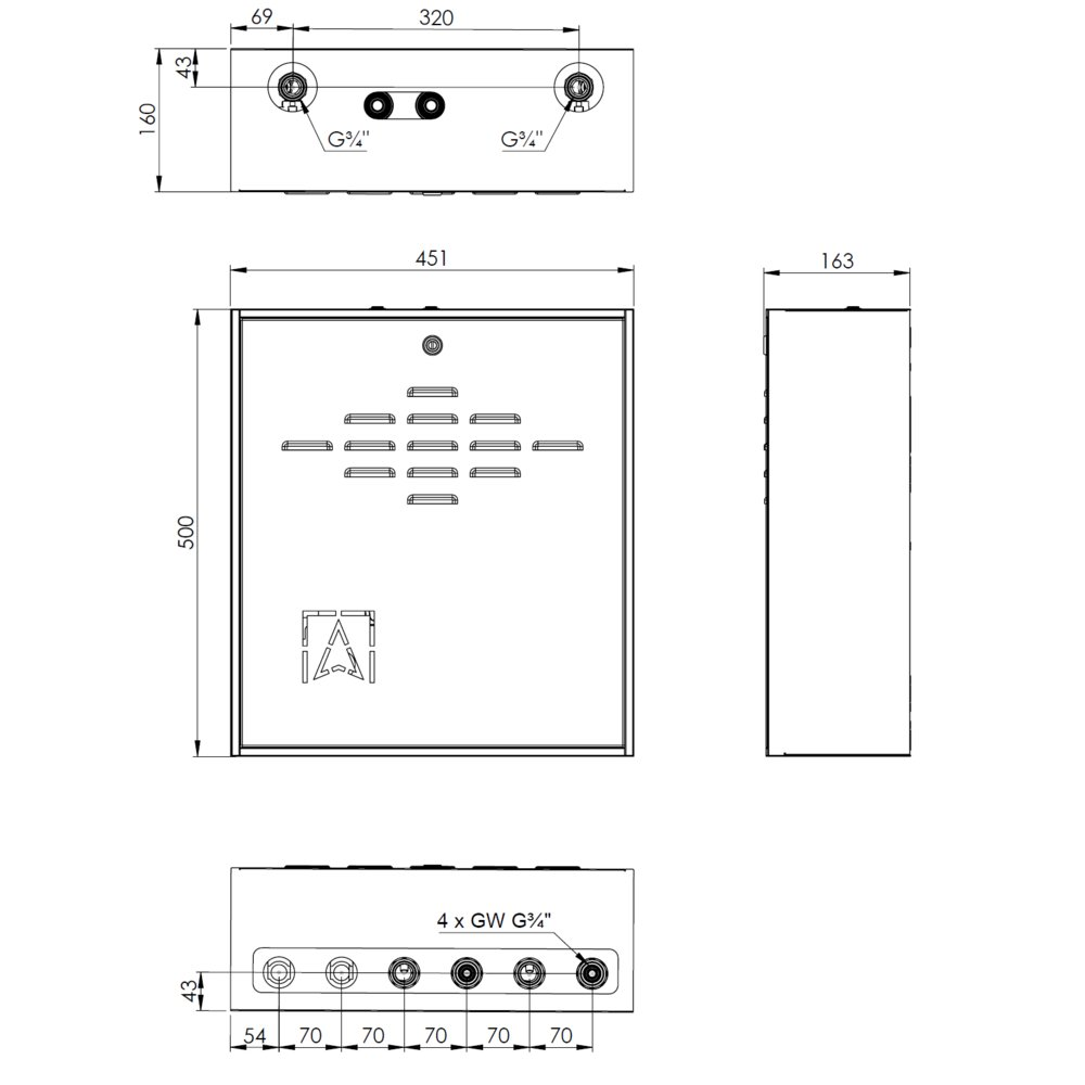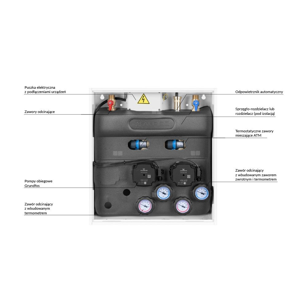 Wyposażony w pompy Grundfos UPm³ oraz 2 mieszające zawory termostatyczne ATM 561.