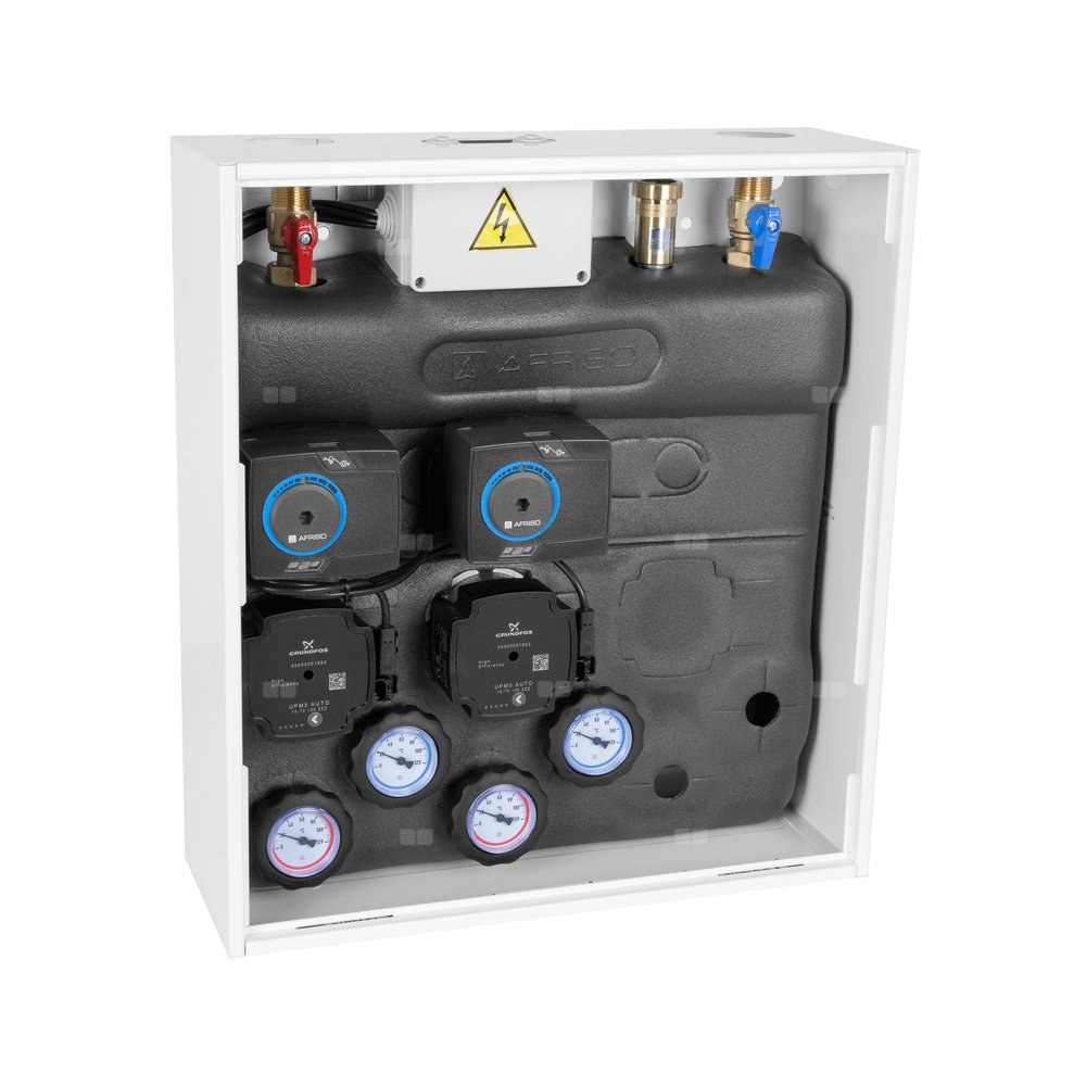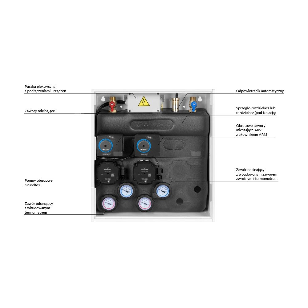 Wyposażony w pompy Grundfos UPm³ oraz zawory obrotowe z siłownikami ARM 141