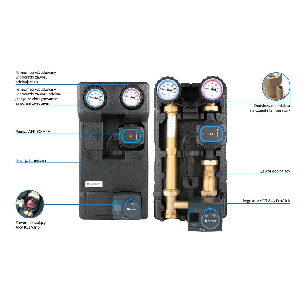 Zainstalowany zawór mieszający ARV KvsVario wartość Kvs ustawiana w zakresie 2,5÷12 m³/h, pompa AFRISO APH 25-7/180 oraz regulator ACT 343 ProClick (stałotemperaturowy, 230 V AC, 120 s).