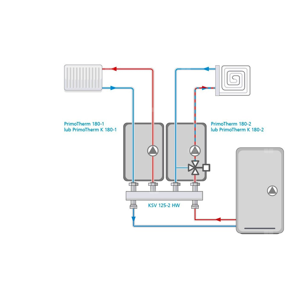 - Stosowana w instalacjach grzewczych i chłodzących.- Montowana na ścianie między źródłem ciepła/ chłodu a instalacją odbiorczą.