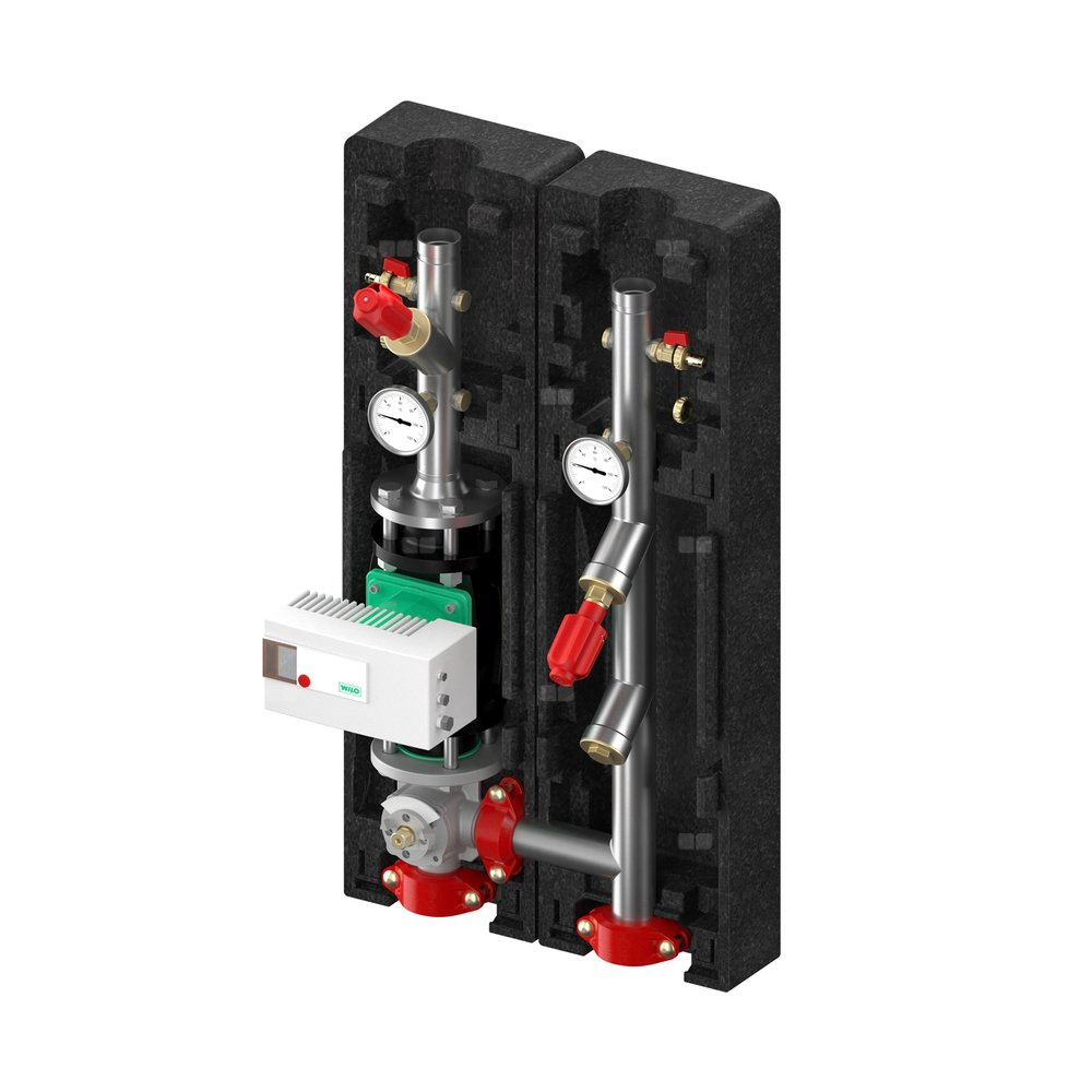 Uzupełnienie systemu dużych rozdzielaczy, z pompą obiegową lub bez; rozstaw osi od 250 mm, 3 zawory odcinające, zintegrowany zawór zwrotny, 3 drogowy zawór mieszający, 3 zawory kulowe napełniająco-spustowe, 2 termometry, dodatkowe przyłącza 1/2" na zasilaniu i na powrocie, filtr siatiowy, orurowanie i części przyłączeniowe, w tym Złączki BigFixLock do rozdzielacza (przyłącze DN 50 dla wszystkich modeli), stalowa bez szwu zgodnie z wymiarami pompy, izolacja EPP.