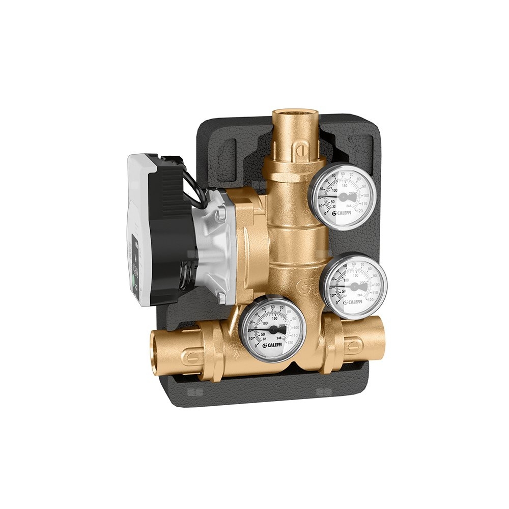Grupa pompowa do cyrkulacji czynnika grzewczego z zaworem termostatycznym zabezpieczającym kotły na paliwo stałe przed zbyt niską temperaturą powrotu Z izolacją. Temperatura pełnego zamknięcia obejścia: Tmin = Tset +10°C = Tr. Pompa o wysokiej wydajności: UPM3S Auto 25-60, UPML 25-105. Przyłącze: G 1 1/4" (ISO 228-1) GW, złączka. Maksymalne ciśnienie pracy: 10 bar. Zakres temperatury medium: 5–100 °C. Nastawa: 60 °C. Maksymalne stężenie glikolu: 50 %. Medium: Roztwory glikolu, woda. Maksymalne zalecane natężenie przepływu: 2 m³/h. DN: DN 25 (korpus). Rodzaj pompy: Para 15-7. Materiał: mosiądz.