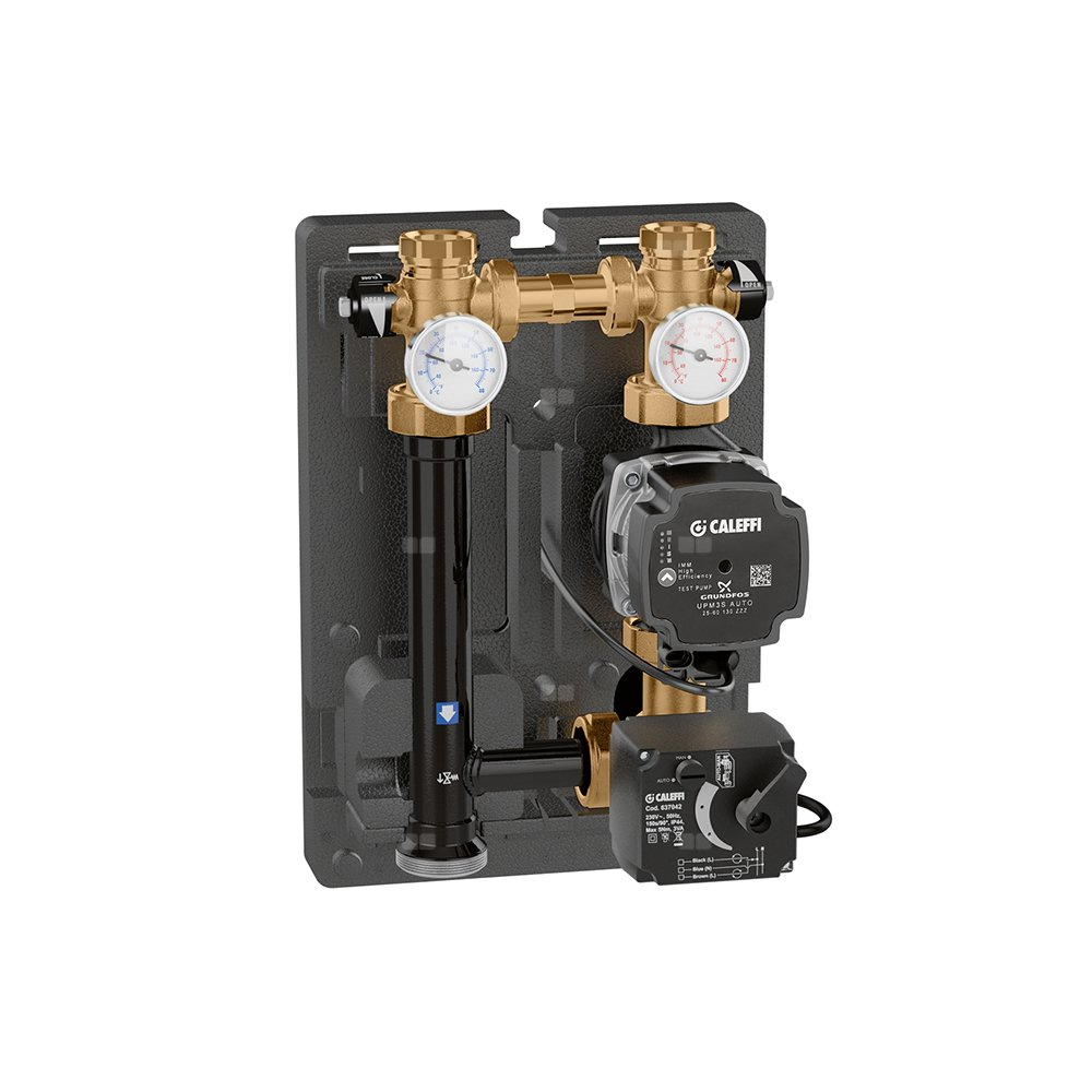 Grupa pompowa z zaworem mieszającym z siłownikiem dla instalacji centralnego ogrzewania.