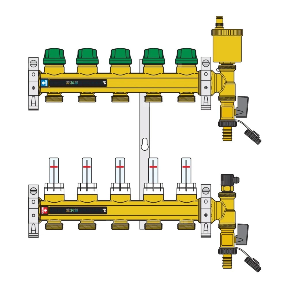 Zespół rozdzielaczy Zawiera: - rozdzielacz powrotny z wkładkami równoważącymi DYNAMICAL® przystosowanymi do współpracy z siłownikami elektrotermicznymi, zakres regulacji 25÷170 l/h; - rozdzielacz zasilania z przepływomierzami; - zakończenie rozdzielacza z automatycznym odpowietrznikiem z kapturkiem higroskopijnym i zaworem spustowym; - stalowe uchwyty montażowe do zastosowania w skrzynkach lub bezpośrednio na ścianie. główne podłączenie: G 1" (ISO 228-1) GW, Podłączenie do złączek Caleffi. przyłącza wylot: G 3/4" A (ISO 228-1) GZ, 12 wyjść. Maksymalne ciśnienie pracy: 6 bar. Zakres temperatury medium: 5–60 °C. Rozstaw wyjść: 50 mm. Zakres regulacji natężenia przepływu: 25–150 l/h.