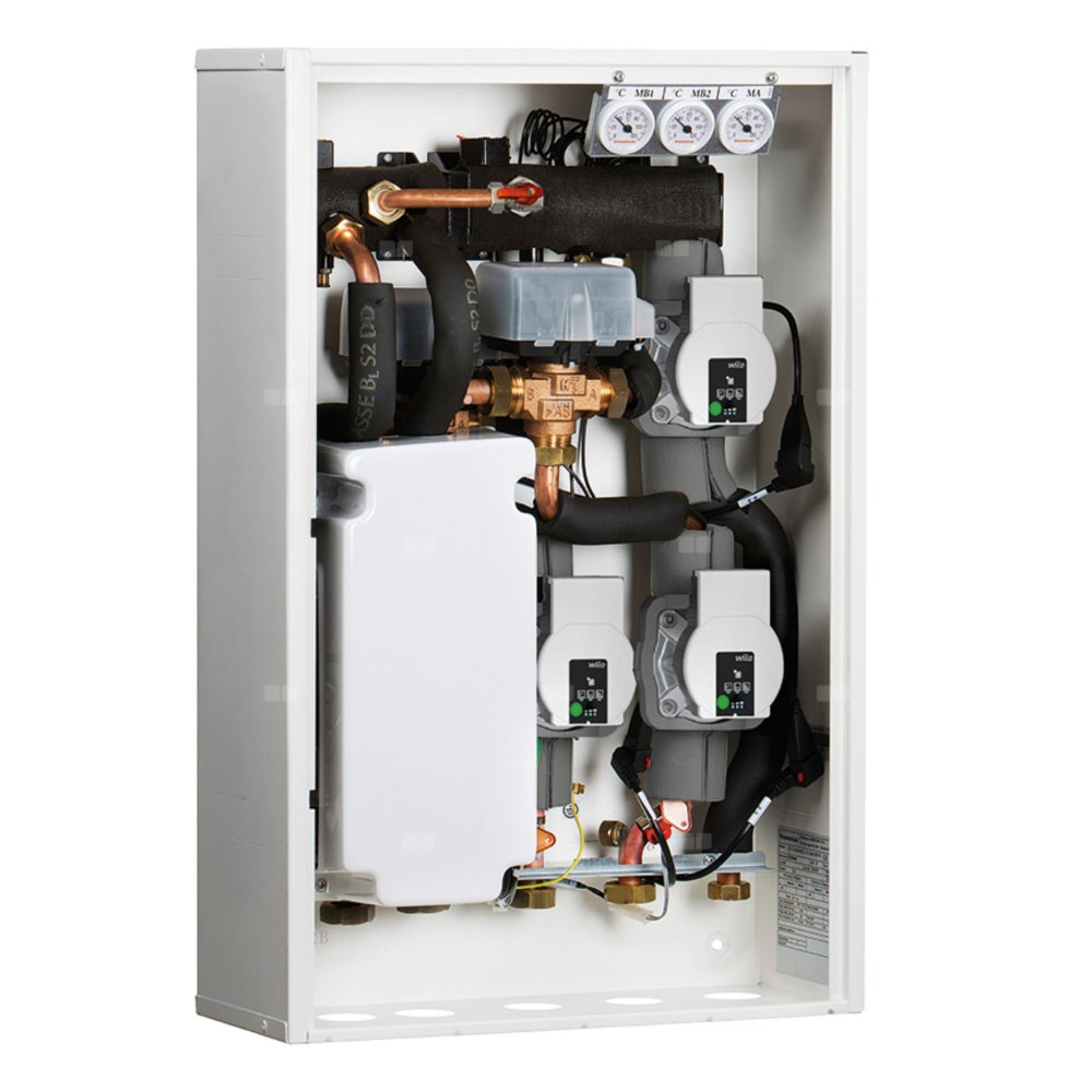 1.Do współpracy z pompami ciepła. 2.Zawiera: transformator 24V, moduły strefowe, pompy i sondę NTC zasilania oraz zawory mieszające dla każdej strefy