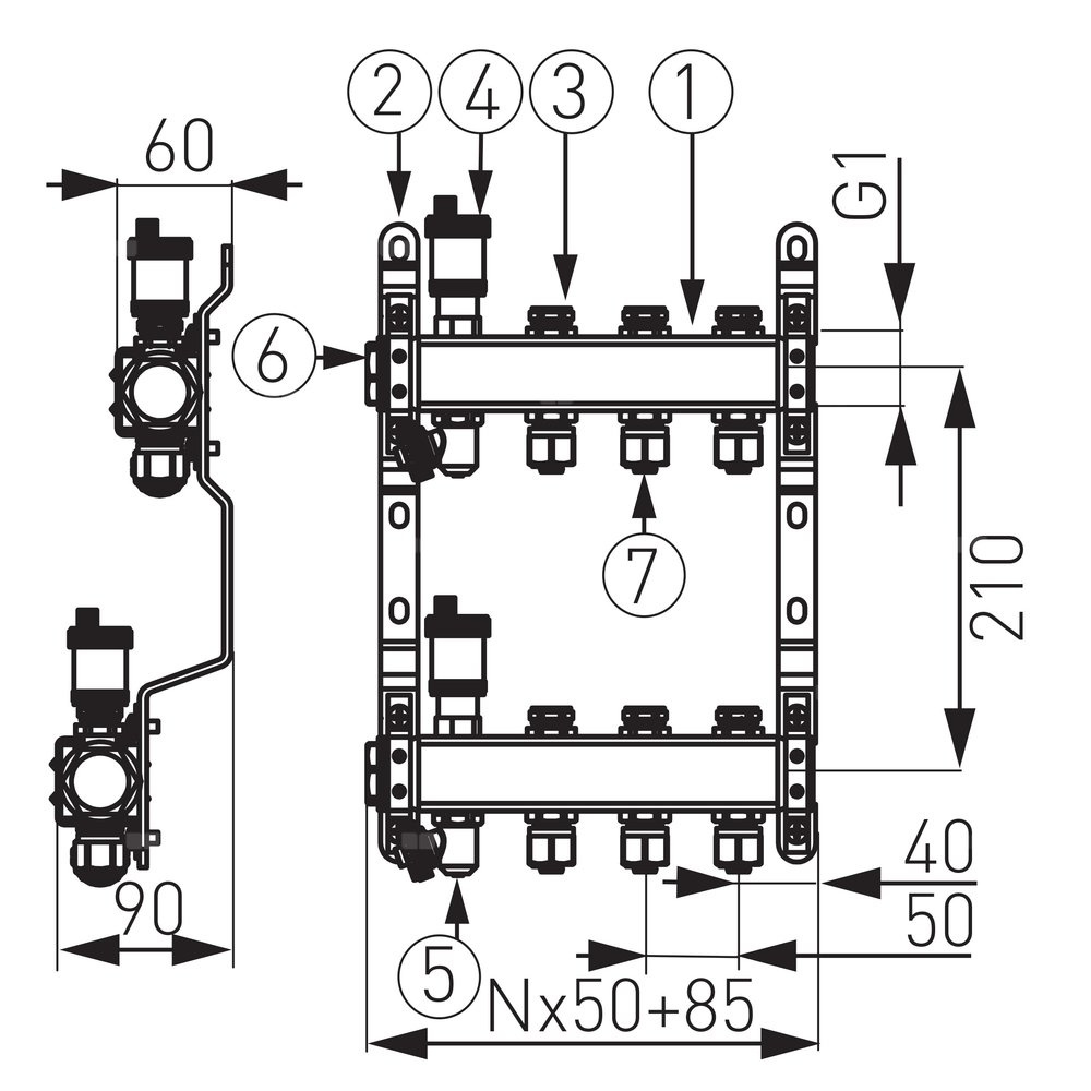 Rozdzielacz 11-drogowy (do systemów c.o. i c.w.u.) z zaworami odcinającymi obwody, ze złączkami, stal nierdzewna