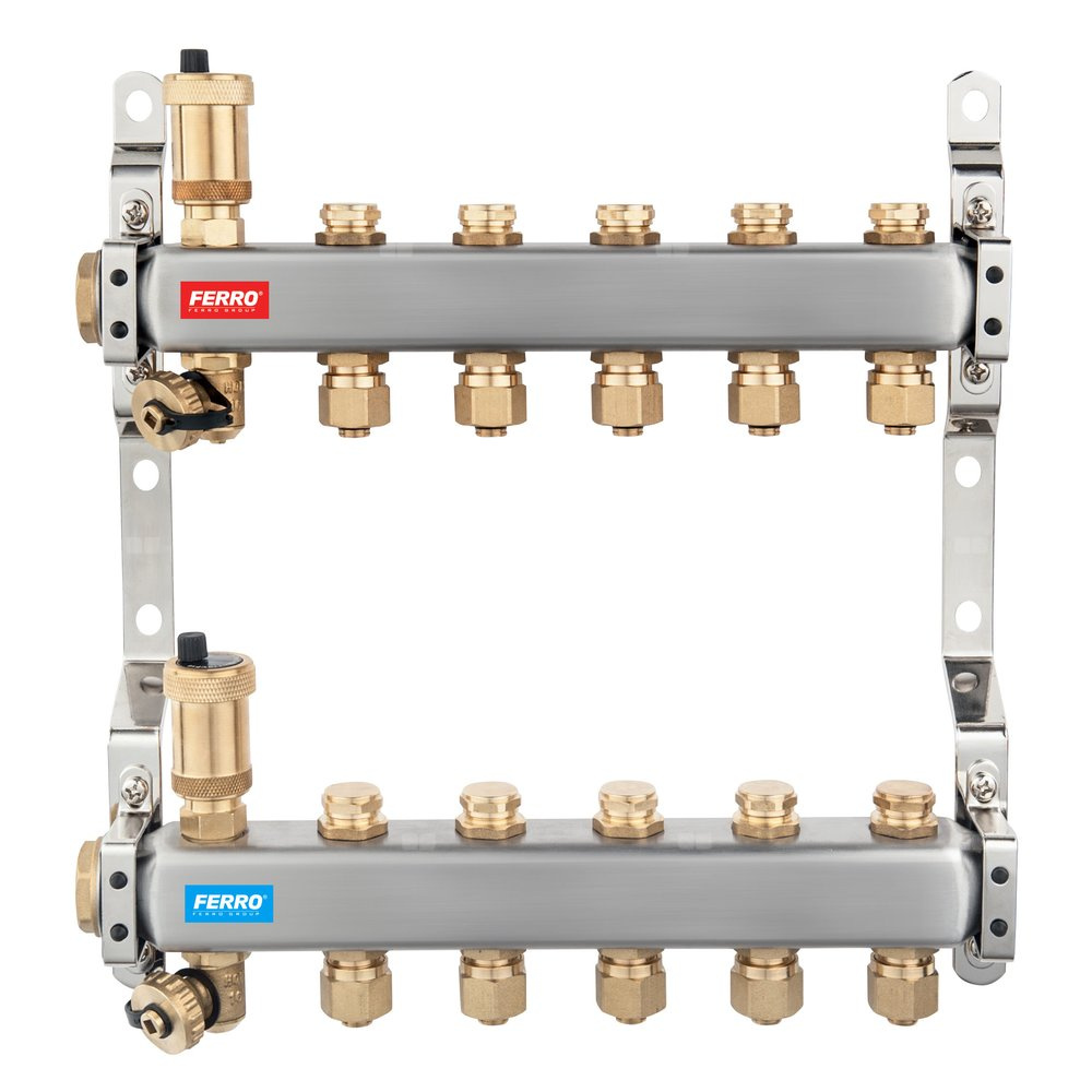 Rozdzielacz 5-drogowy (do systemów c.o. i c.w.u.) z zaworami odcinającymi obwody, ze złączkami, stal nierdzewna