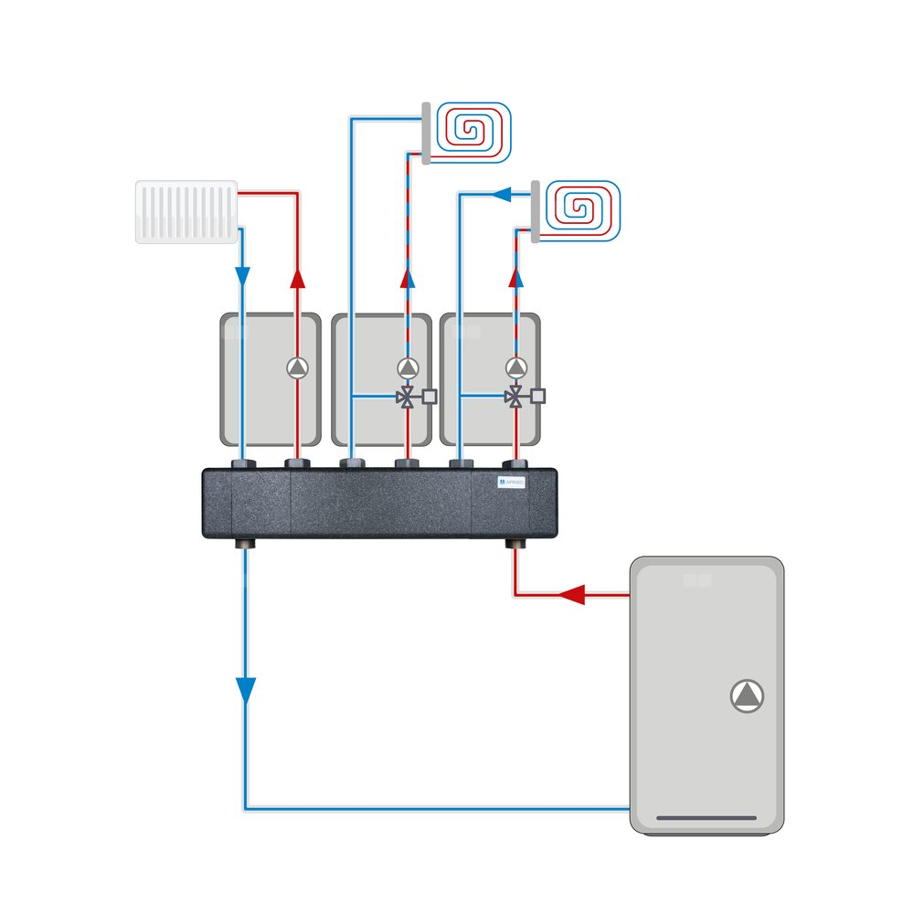 Przeznaczony do szybkiego i wygodnego podłączenia trzech grup pompowych PrimoTherm do źródła ciepła.