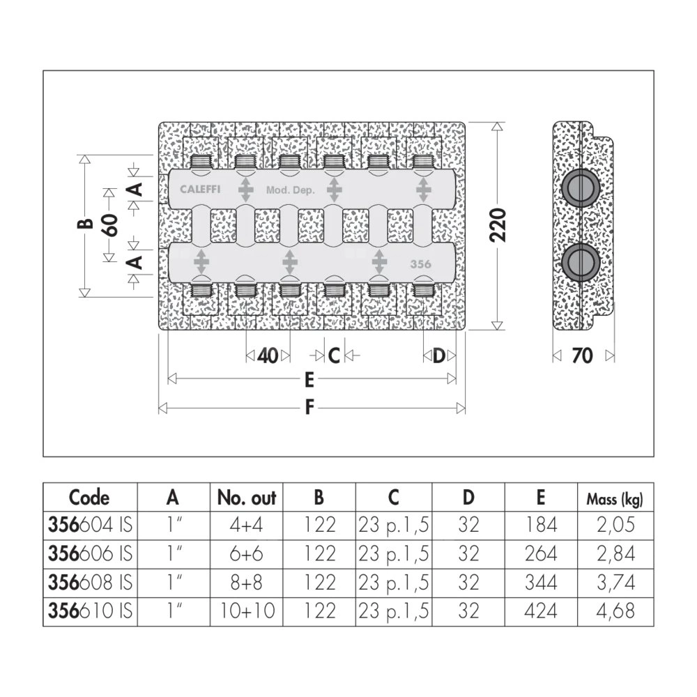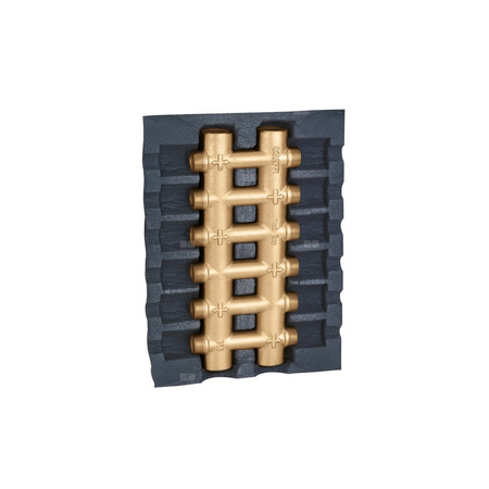 Rozdzielacz podwójny - monoblok Z izolacją. Dla instalacji grzewczych i chłodniczych. Przyłącze: G 1" (ISO 228-1) GW, Podłączenie do złączek Caleffi. przyłącza wylot: 23 p.1,5, 6 wyjść. Maksymalne ciśnienie pracy: 10 bar. Zakres temperatury medium: 0–100 °C. Rozstaw przyłączy głównych: 60 mm. Rozstaw wyjść: 40 mm.