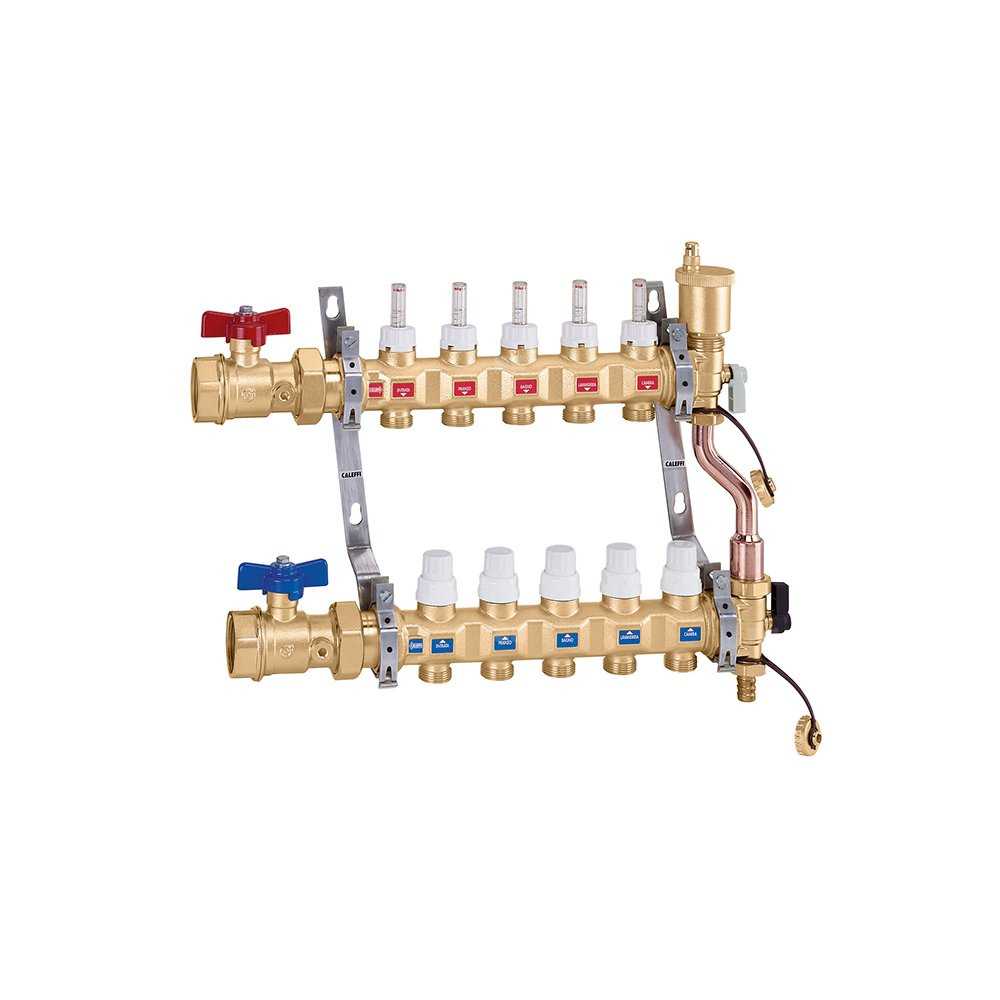 Zespół rozdzielaczy Zawiera: - rozdzielacz zasilający z wbudowanymi przepływomierzami i zaworami równoważącymi natężenie przepływu; - rozdzielacz powrotny z wbudowanymi zaworami odcinającymi z przyłączem do siłownika termoelektrycznego; - zakończenia rozdzielacza z wielopozycyjnym zaworem kulowym, automatycznym odpowietrznikiem i króćcem napełniającym/spustowym; - niecentryczne obejście różnicowe ze stałą nastawą i rurą połączeniową; - zawory odcinające kulowe; - uchwyty montażowe do montażu w skrzynce lub montażu naściennego główne podłączenie: G 1" (ISO 228-1) GW, Podłączenie do złączek Caleffi. przyłącza wylot: G 1" (ISO 228-1) GW, 13 wyjść. Maksymalne ciśnienie pracy: 10 bar. Zakres temperatury medium: 0–80 °C.
