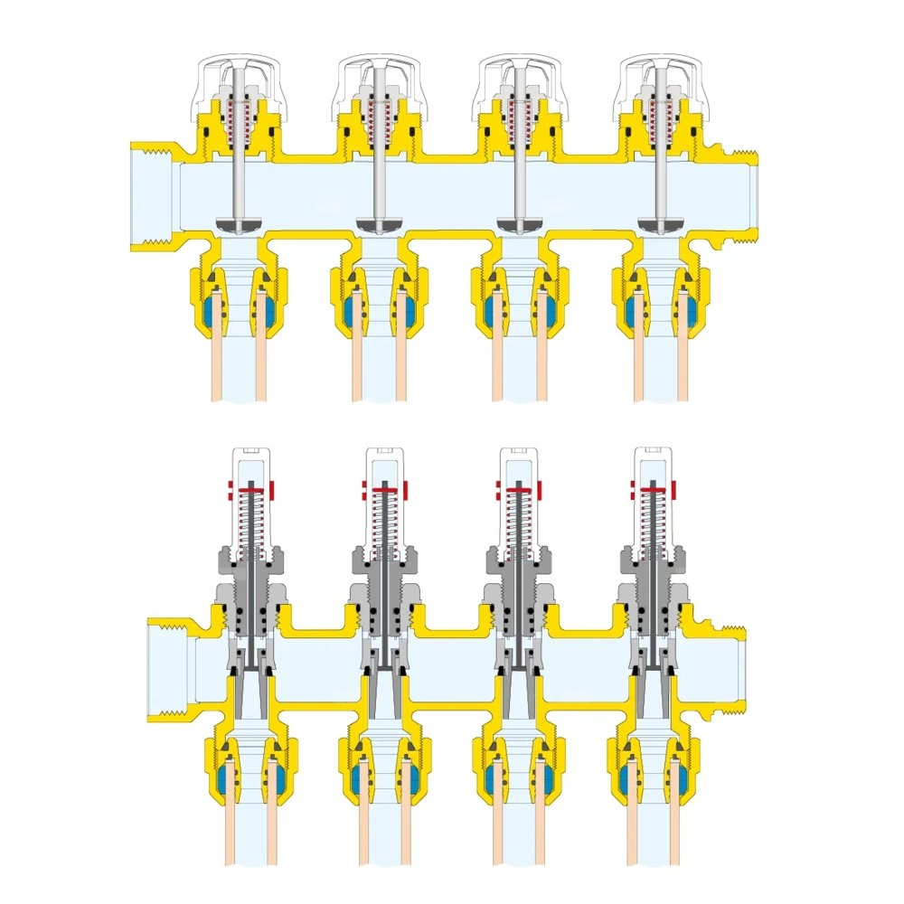 Zespół rozdzielaczy Zawiera: - rozdzielacz powrotny z wbudowanymi zaworami odcinającymi do siłownika termoelektrycznego; - rozdzielacz zasilający z przepływomierzami o skali 0-5 l/min i zaworami regulacyjnymi; - zakończenia rozdzielacza z automatycznym zaworem odpowietrzającym i zaworem spustowym; - uchwyty montażowe z technopolimeru z regulowaną odległością od środka do użycia ze skrzynkami serii 659 lub do bezpośredniego mocowania na ścianie. główne podłączenie: G 1" (ISO 228-1) GW, Podłączenie do złączek Caleffi. przyłącza wylot: G 3/4" A (ISO 228-1) GZ, 10 wyjść. Maksymalne ciśnienie pracy: 6 bar. Zakres temperatury medium: 5–60 °C. Rozstaw wyjść: 50 mm. Zakres regulacji natężenia przepływu: 0–5 l/min.