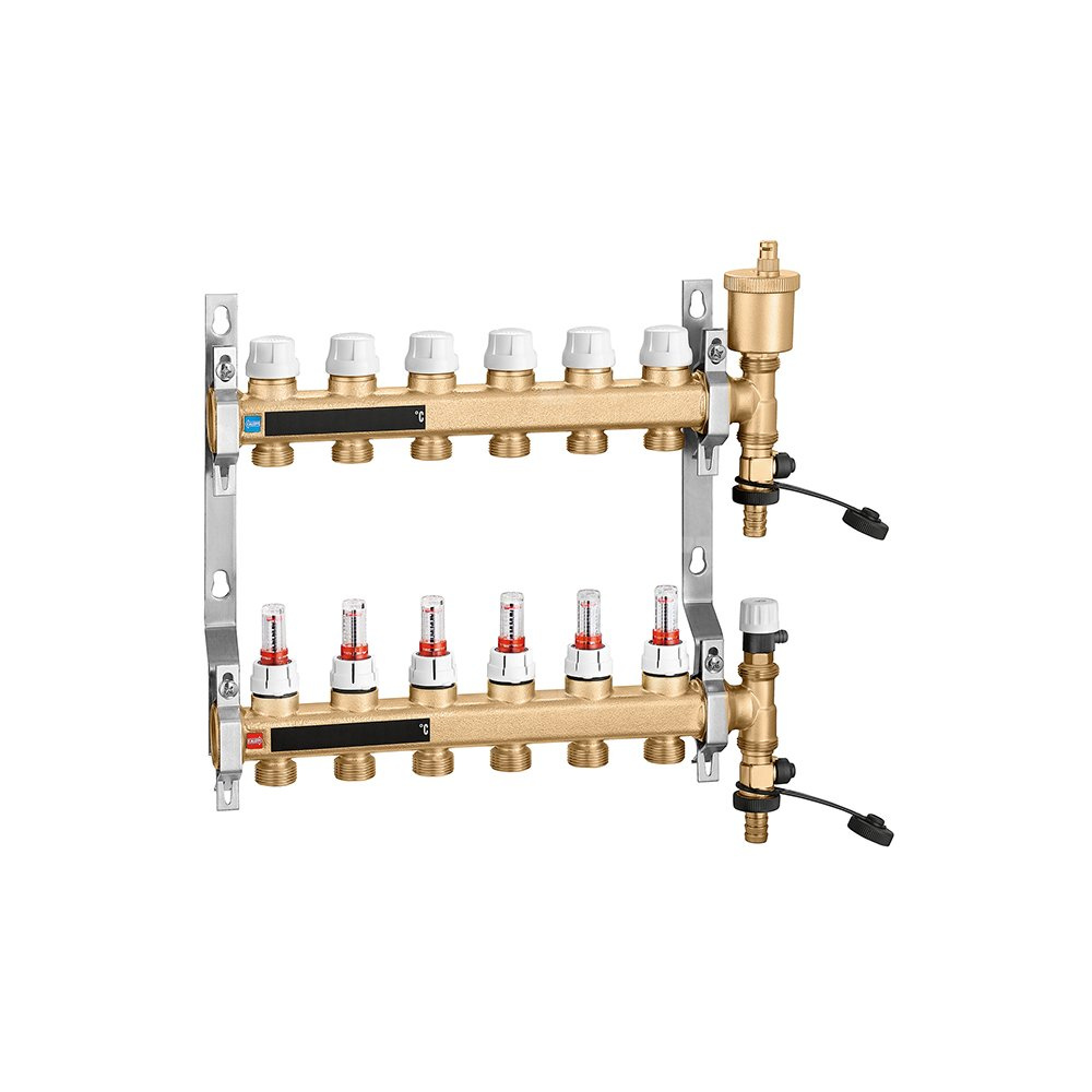 Zespół rozdzielaczy Zawiera: - rozdzielacz powrotny z wbudowanymi zaworami odcinającymi do siłownika termoelektrycznego; - rozdzielacz zasilający z przepływomierzami o skali 0-5 l/min i zaworami regulacyjnymi; - zakończenia rozdzielacza z automatycznym zaworem odpowietrzającym i zaworem spustowym; - uchwyty montażowe z technopolimeru z regulowaną odległością od środka do użycia ze skrzynkami serii 659 lub do bezpośredniego mocowania na ścianie. główne podłączenie: G 1" (ISO 228-1) GW, Podłączenie do złączek Caleffi. przyłącza wylot: G 3/4" A (ISO 228-1) GZ, 8 wyjść. Maksymalne ciśnienie pracy: 6 bar. Zakres temperatury medium: 5–60 °C. Rozstaw wyjść: 50 mm. Zakres regulacji natężenia przepływu: 0–5 l/min.