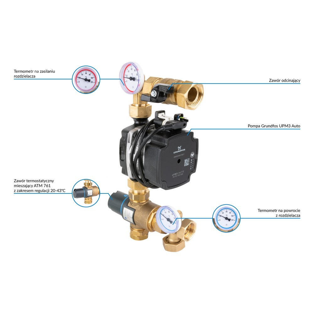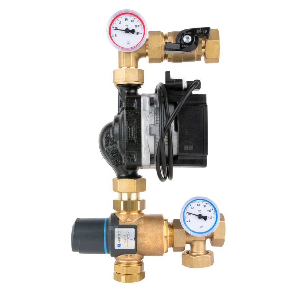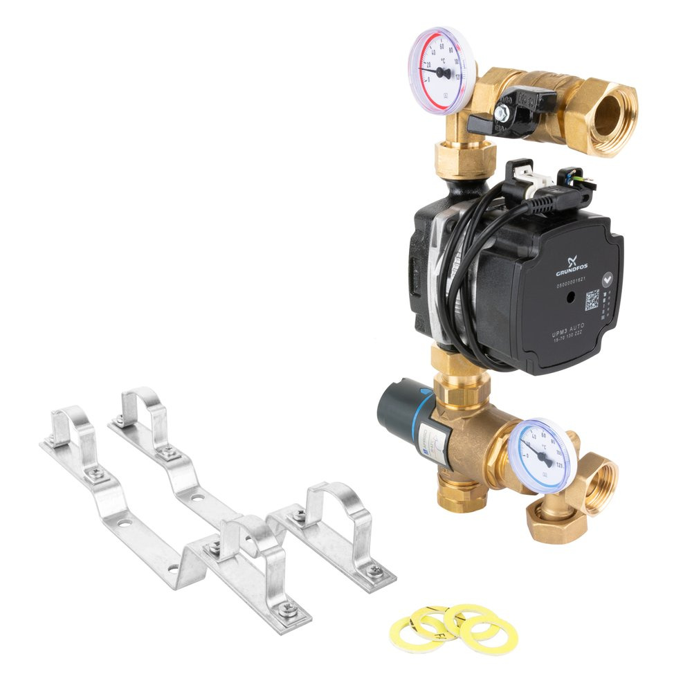 Grupa pompowa AFRISO BTU 502 nakrętka x nakrętka 1'' x 1'', z zaworem mieszającym, z pompą obiegową Grunfos UPM3 Auto