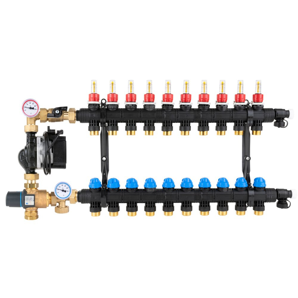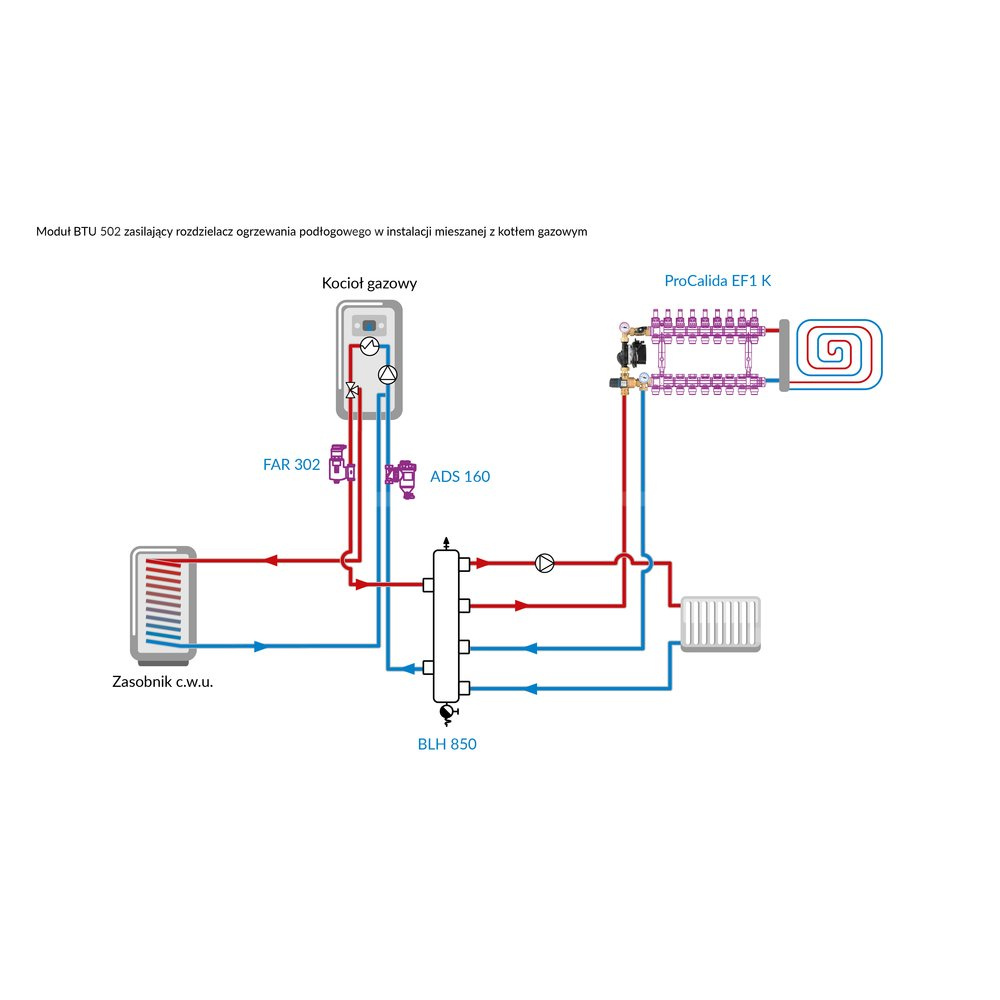 Stosowany w instalacjach grzewczych.Montowany między źródłem ciepła a rozdzielaczem ogrzewania płaszczyznowego w szafce rozdzielacza.