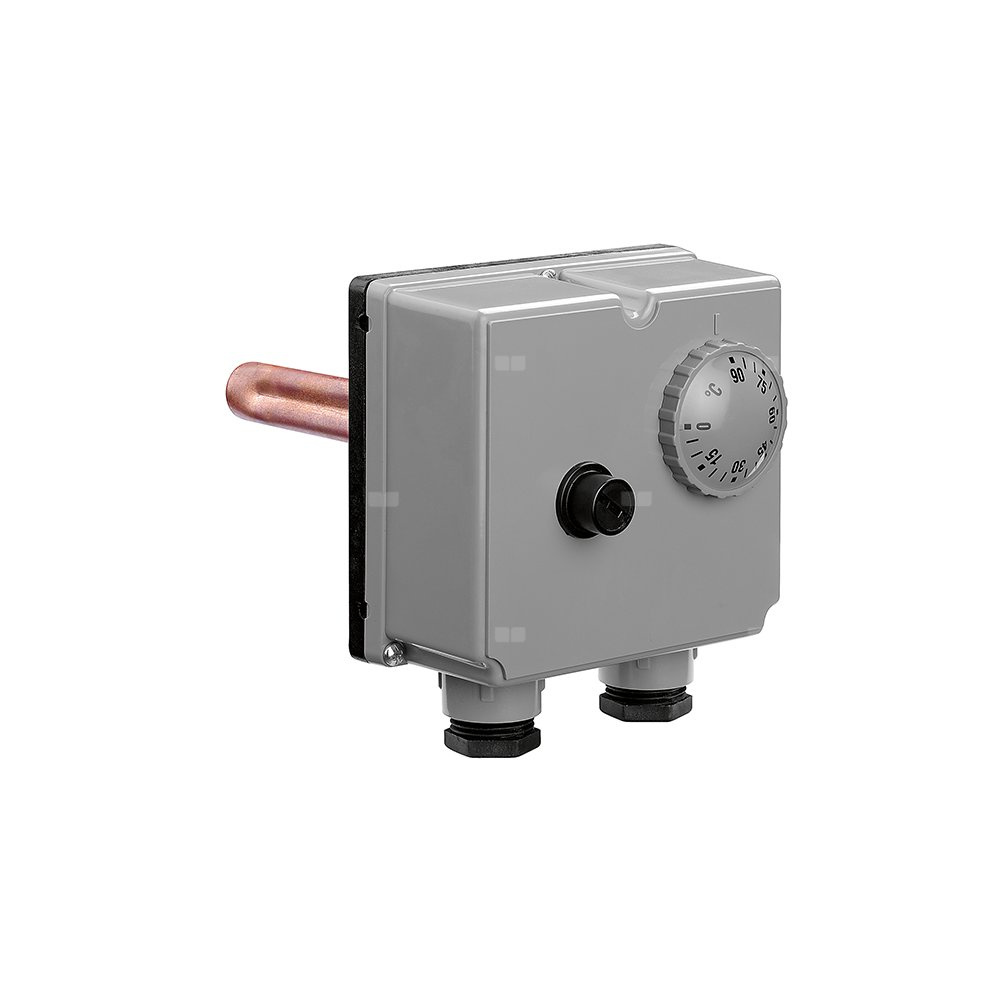 Termostat podwójnego działania z sondą zanurzeniową Z homologacją INAIL (wcześniej ISPESL), (D.M.1.12.1975). Zakres regulacji temperatury: 0–90 °C. Podwójna nastawa termostatu bezpieczeństwa: 100 °C. Stopień ochrony: IP 40.