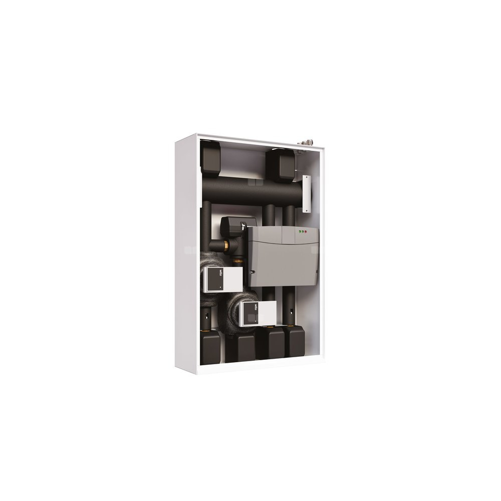 Zewnętrzny moduł hydrauliczny z możliwością pracy w trybie chłodzenia - 1 strefa gorąca, 1 strefa chłodna (podłogowa) z wbudowanymi 2 pompami modulowanymi, zaworem mieszającym z siłownikiem oraz układem sterowania do połączenia z pompą ciepła