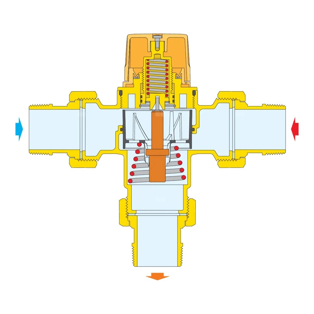 Termostatyczny zawór mieszający do scentralizowanych instalacji solarnych Wewnętrzny element regulacyjny wykonany z technopolimeru zabezpieczony przed osadzaniem kamienia. Przyłącze: R 1 1/2" (EN 10226-1) GZ, złączka. Maksymalne ciśnienie pracy: 14 bar. Zakres temperatury medium: 0–100 °C. Zakres regulacji temperatury: 35–65 °C. Kv: 11,0 m³/h. Materiał: stop mosiądzu odporny na odcynkowanie.