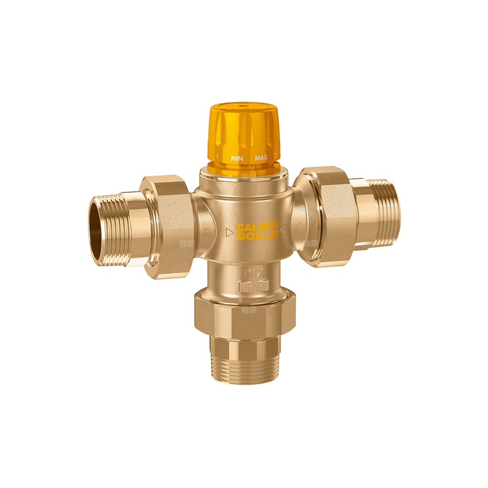 Termostatyczny zawór mieszający do scentralizowanych instalacji solarnych Wewnętrzny element regulacyjny wykonany z technopolimeru zabezpieczony przed osadzaniem kamienia. Przyłącze: R 1 1/4" (EN 10226-1) GZ, złączka. Maksymalne ciśnienie pracy: 14 bar. Zakres temperatury medium: 0–100 °C. Zakres regulacji temperatury: 35–65 °C. Kv: 7,6 m³/h. Materiał: stop mosiądzu odporny na odcynkowanie.