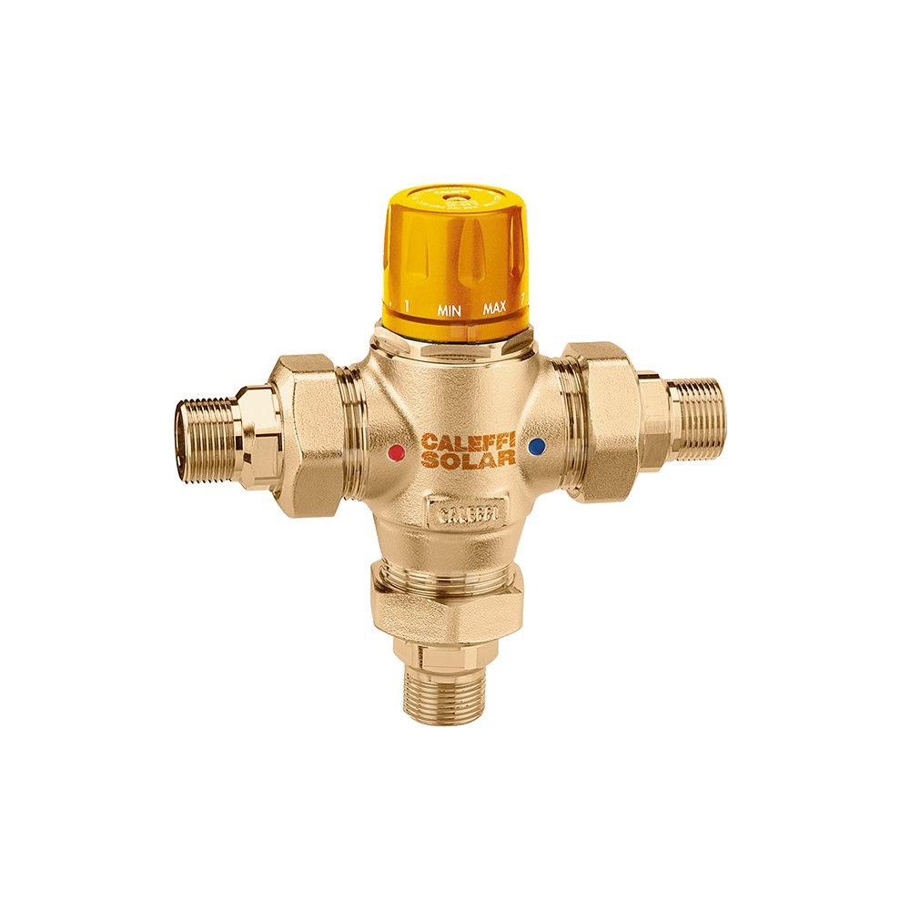 Termostatyczny zawór mieszający, z wymiennym wkładem, do instalacji solarnych Przyłącze: G 1 1/2" A (ISO 228-1) GZ, złączka. Maksymalne ciśnienie pracy: 14 bar. Zakres temperatury medium: 0–110 °C. Zakres regulacji temperatury: 35–65 °C. Kv: 14,5 m³/h. Materiał: mosiądz.