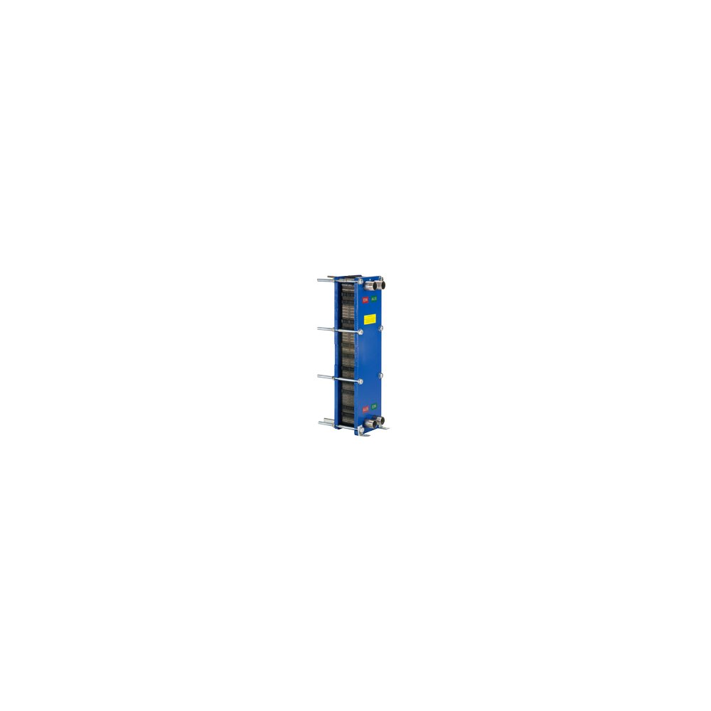 Płytowy, skręcany, wymiennik ciepła ze stali szlachetnej – pośredni wymiennik ciepła do zanieczyszczonych źródeł ciepła lub źródeł ciepła o niskiej jakości wody. Przyłącza po stronie ciepłej i zimnej z gwintem zewnętrznym. Maksymalne ciśnienie robocze 10 barów, maks. temperatura 80°C. Przyłącze źródła ciepła 1¼”.
