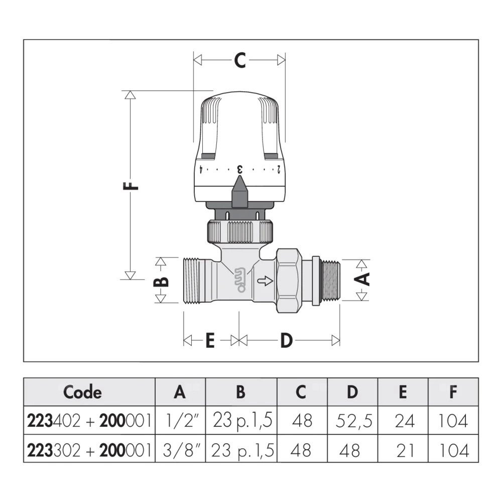 Prosty grzejnikowy zawór termostatyczny przystosowany do montażu głowic termostatycznych lub siłowników termoelektrycznych. Do rur miedzianych i z tworzyw sztucznych jedno- i wielowarstwowych. podłącznie rury: 23 p. 1,5, wlot, podłączenie proste, Podłączenie do złączek Caleffi. podłączenie grzejnika: G 1/2" A (ISO 228-1) GZ, wylot, podłączenie proste. Maksymalne ciśnienie pracy: 10 bar. Zakres temperatury medium: 5–100 °C. Wykończenie: chromowane. Kvs: 1,52 m³/h. Materiał: mosiądz.