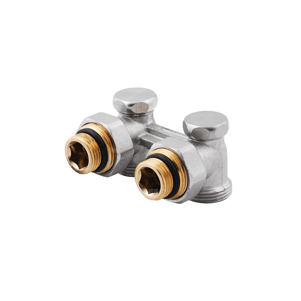 Do podłączenia grzejników z gwintami zewnętrznymi G¾ oraz wewnętrznymi G½. Komplet zawiera: zespół zaworów kątowych oraz złączki redukcyjne (nyple redukcyjne). Specjalna końcówka stożkowa umożliwia montaż zespołu do grzejników dolnozasilanych z gwintami zewnętrznymi, natomiast nyple służą do montażu zespołu z grzejnikami dolnozasilanymi z gwintami wewnętrznymi. Zespół można montować w instalacjach za pomocą odpowiednich zacisków art. NUT02, art. PHA-090, art. 215E.