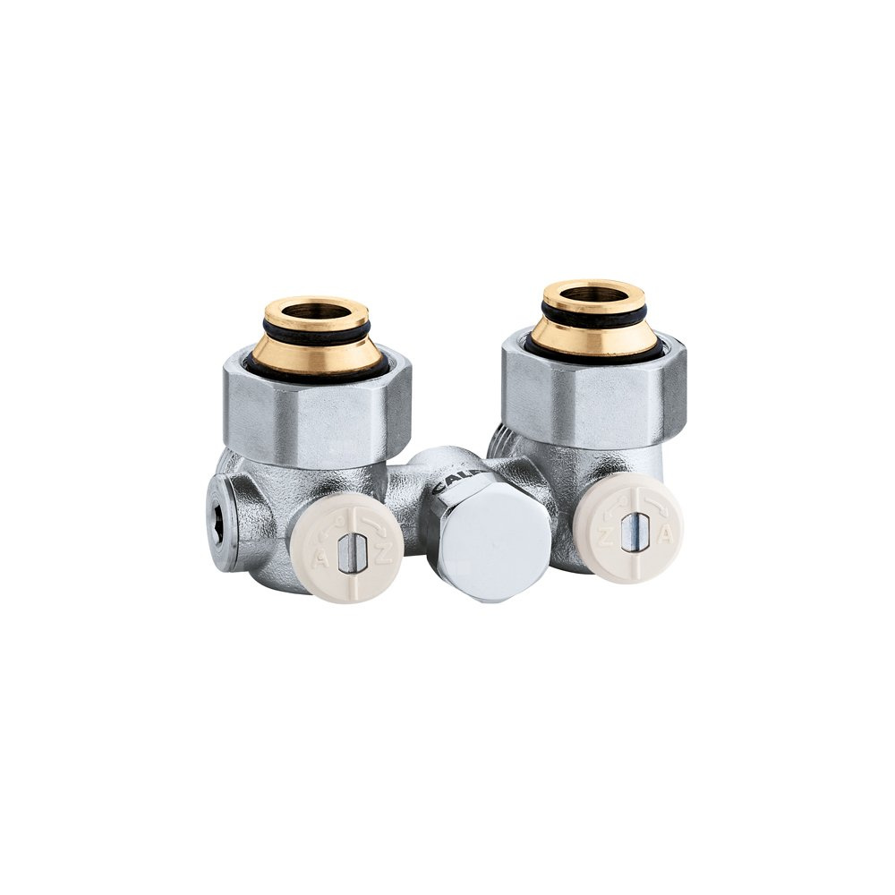 Podwójny zawór podłączeniowy do grzejników stalowych z wkładką termostatyczną. Wersja jednorurowa kątowa - 3/4" GZ