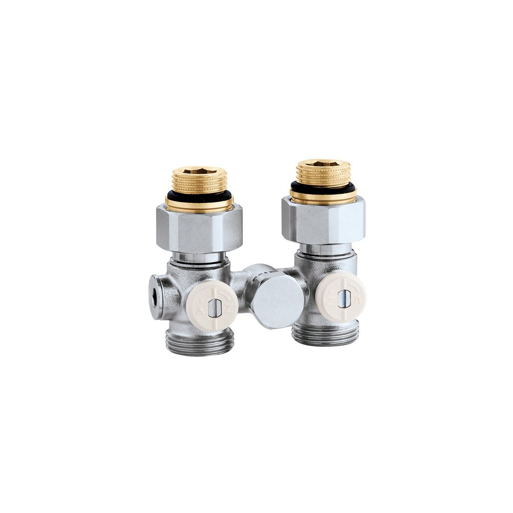 Podwójny zawór podłączeniowy do grzejników stalowych z wkładką termostatyczną. Wersja jednorurowa prosta - 1/2" GZ