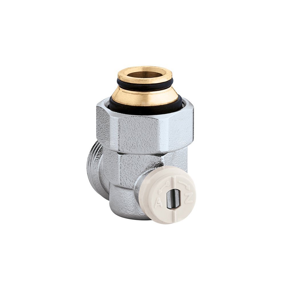 Pojedynczy, kątowy zawór podłączeniowy do grzejników płytowych podłącznie rury: G 3/4" (ISO 228-1) GW, wlot, Podłączenie do złączek Caleffi. podłączenie grzejnika: G 3/4" A (ISO 228-1) GZ, wylot. Maksymalne ciśnienie pracy: 10 bar. Zakres temperatury medium: 5–100 °C.