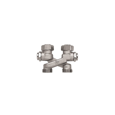 Przyłącze krzyżakowe "X" do rozstawu rur 50 mm, z funkcją odcięcia, napełniania i spustu. Przyłącze G 3/4 ze stożkiem, swobodne nakrętki. Przyłącze do rur z gwintem zewnętrznym G 3/4 ze stożkiem do złączy zaciskowych. Złącza zaciskowe oddzielnie do zamówienia.