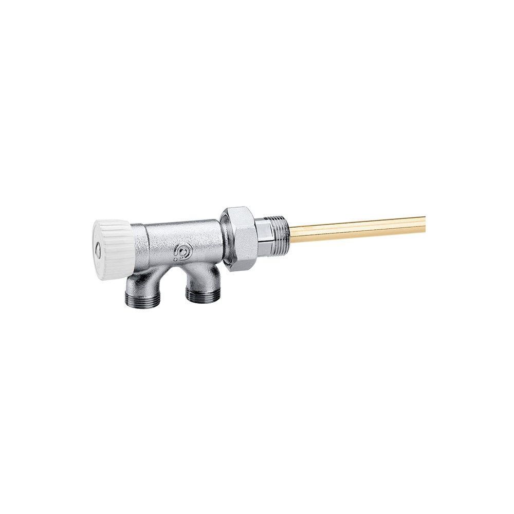Zawór grzejnikowy do instalacji jednorurowych Natężenie przepływu do grzejnika: 100%. Bez szablonu naściennego i rozety maskującej. podłączenie grzejnika: G 3/4" A (ISO 228-1) GZ, wlot, Podłączenie do złączek Caleffi. podłącznie rury: 23 p. 1,5, wylot. Maksymalne ciśnienie pracy: 10 bar. Zakres temperatury medium: 5–100 °C. Rozstaw przyłączy głównych: 40 mm. Wykończenie: chromowane. Długość sondy: 30 cm. Kv: 3,70 m³/h. Materiał: mosiądz.