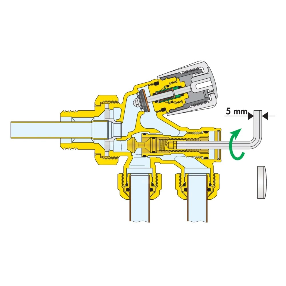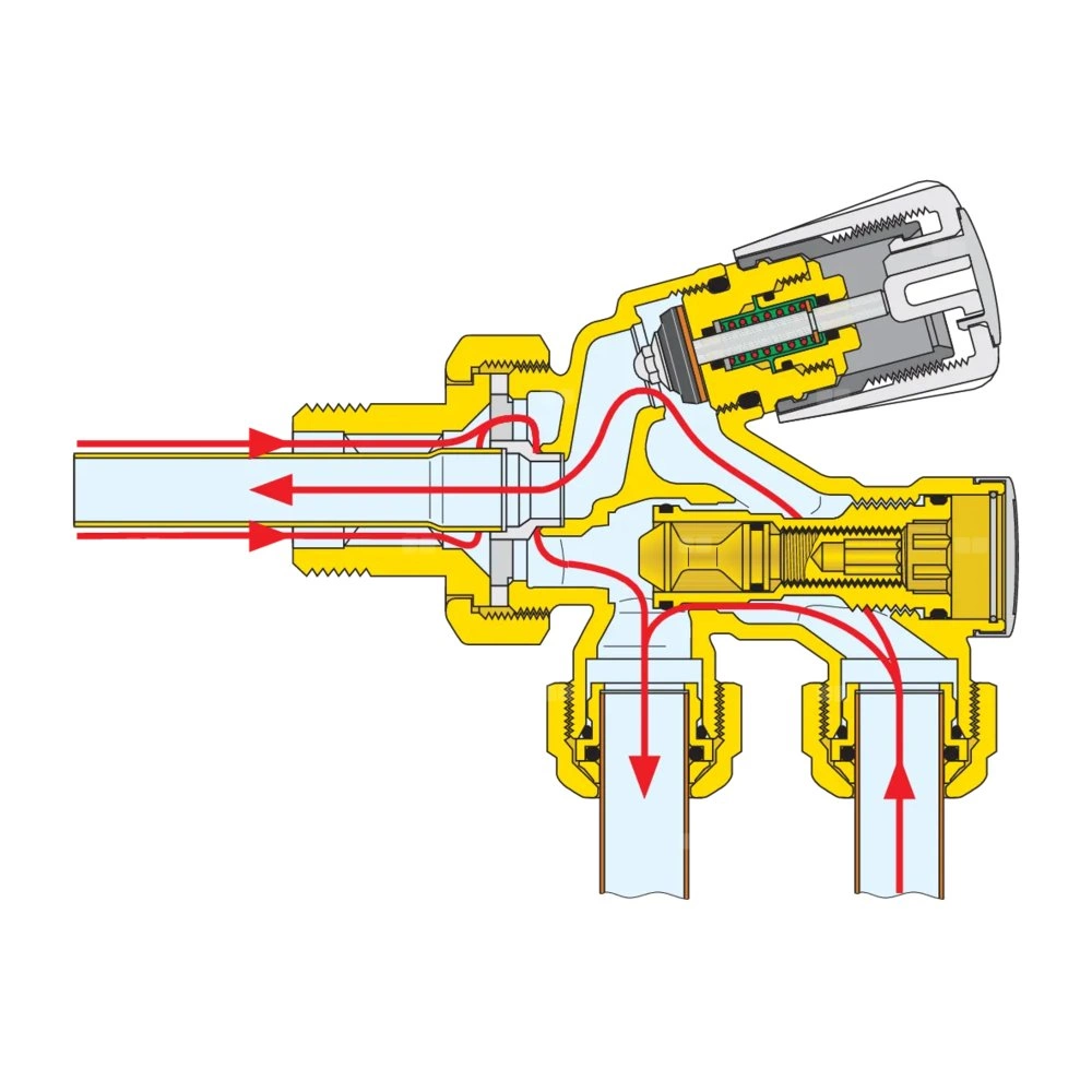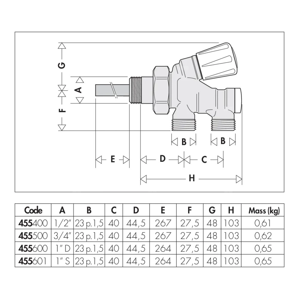 Grzejnikowy zawór termostatyczny z pokrętłem przystosowany do montażu głowic termostatycznych, elektronicznych i siłowników termoelektrycznych Ustawienie fabryczne dla instalacji jednorurowych, możliwość przystosowania dla instalacji dwururowych. podłączenie grzejnika: G 3/4" A (ISO 228-1) GZ, wlot, Podłączenie do złączek Caleffi. podłącznie rury: 23 p. 1,5, wylot. Maksymalne ciśnienie pracy: 10 bar. Zakres temperatury medium: 5–100 °C. Długość sondy: 30 cm. Rozstaw przyłączy głównych: 40 mm. Wykończenie: chromowane. Kv jednorurowe: 2,0 m³/h. Kv dwururowe: 1,10 m³/h. Materiał: mosiądz.