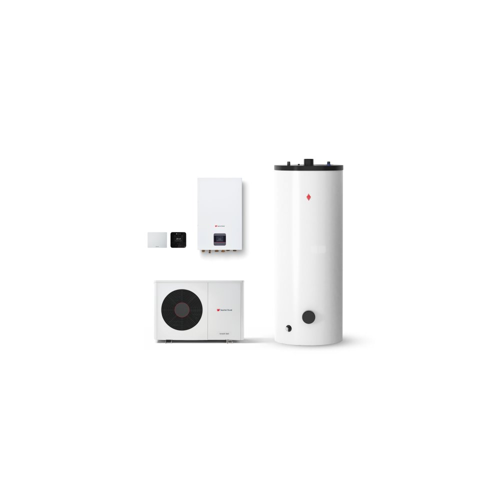 Pompa ciepła powietrze/woda typu split HA 3-8.2 OS 230V, moduł ścienny HA 5-8.2 WSB, regulator MiPro sense SRC 720, zintegrowany moduł internetowy SR 940, zasobnik cwu FEW 250, czujnik cwu w dostawie z modułem ściennym.
