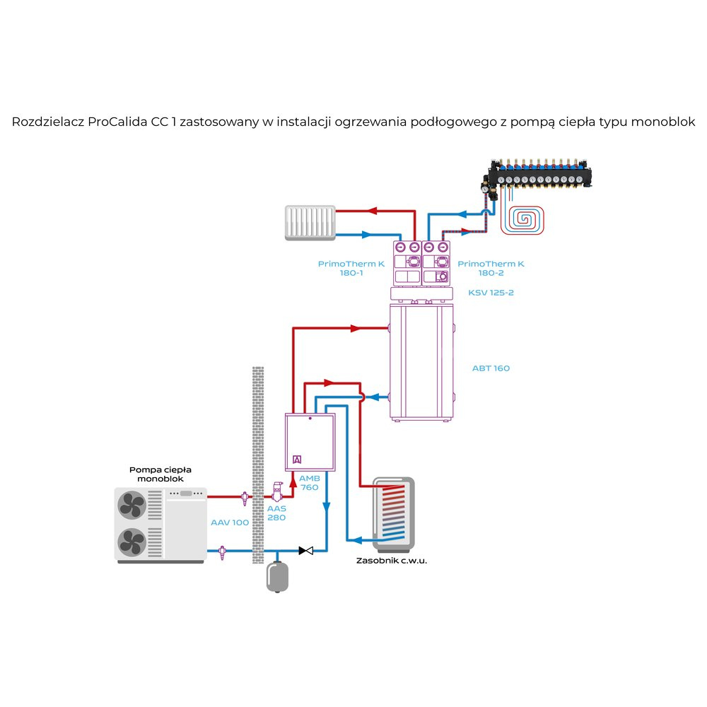 Rozprowadza ciepło / chłód ze źródła na poszczególne pętle instalacji płaszczyznowej.