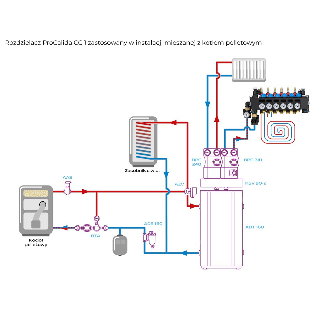 Rozprowadza ciepło / chłód ze źródła na poszczególne pętle instalacji płaszczyznowej.